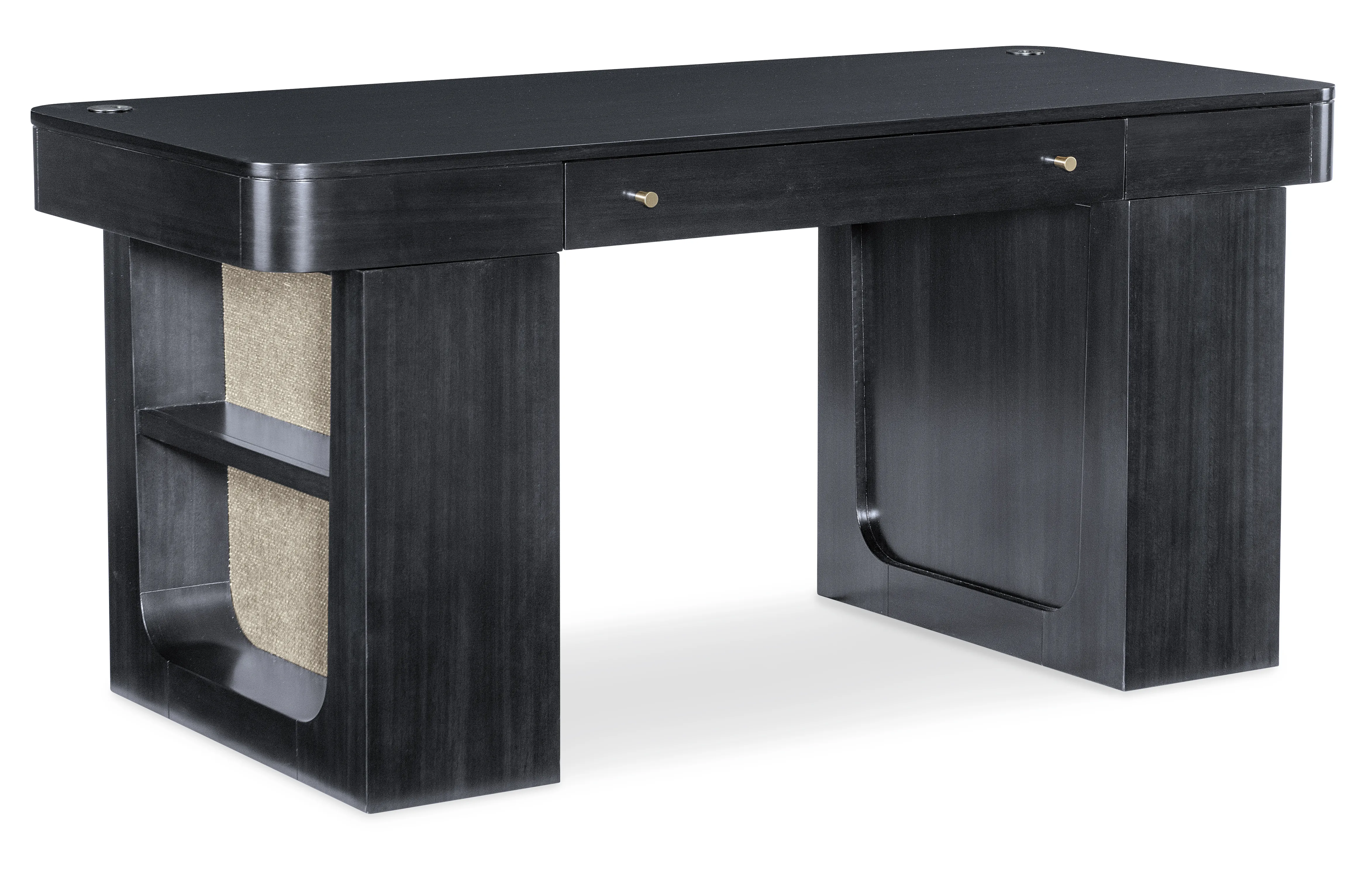 - End panels feature one fixed shelf on each side with grass cloth back panels