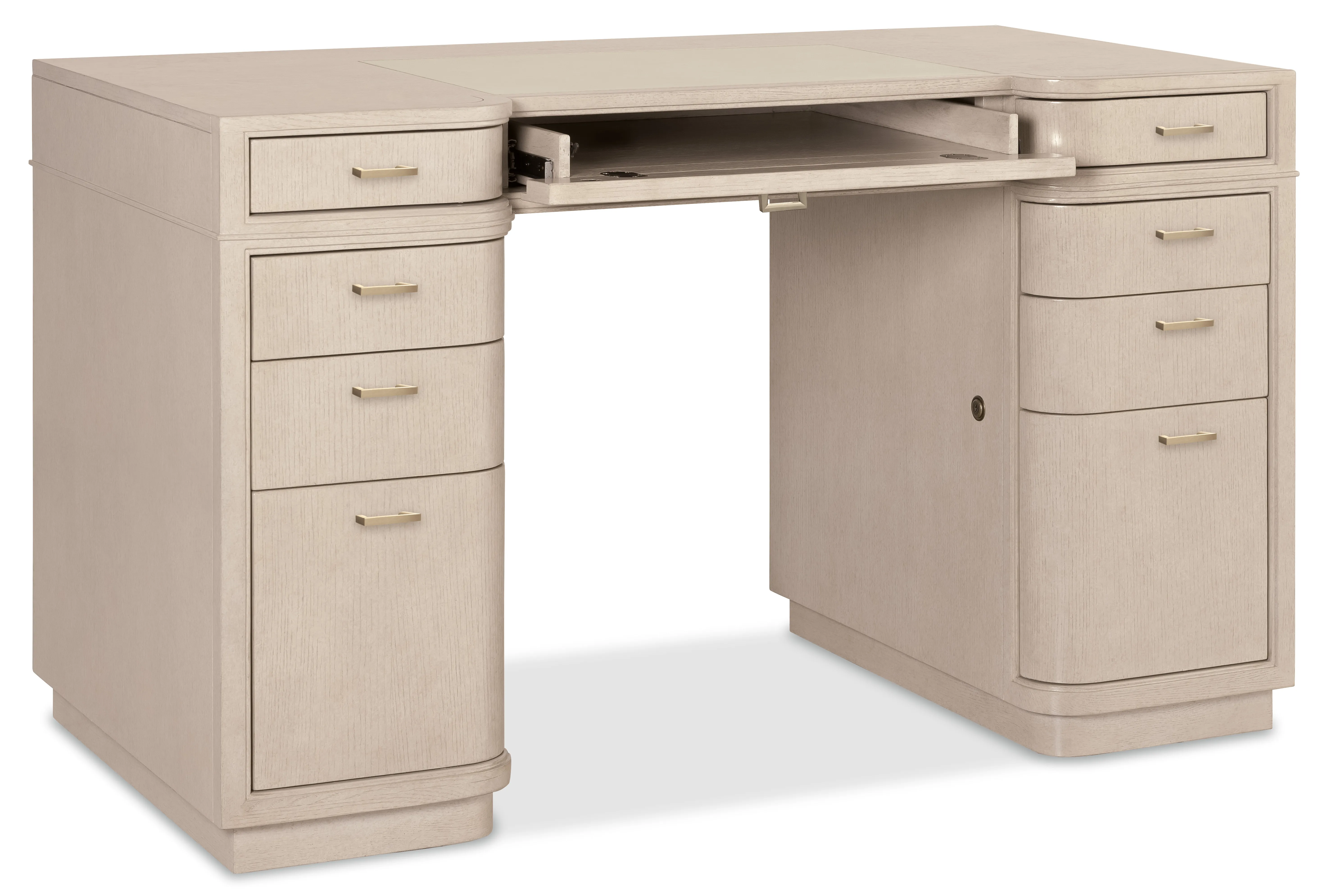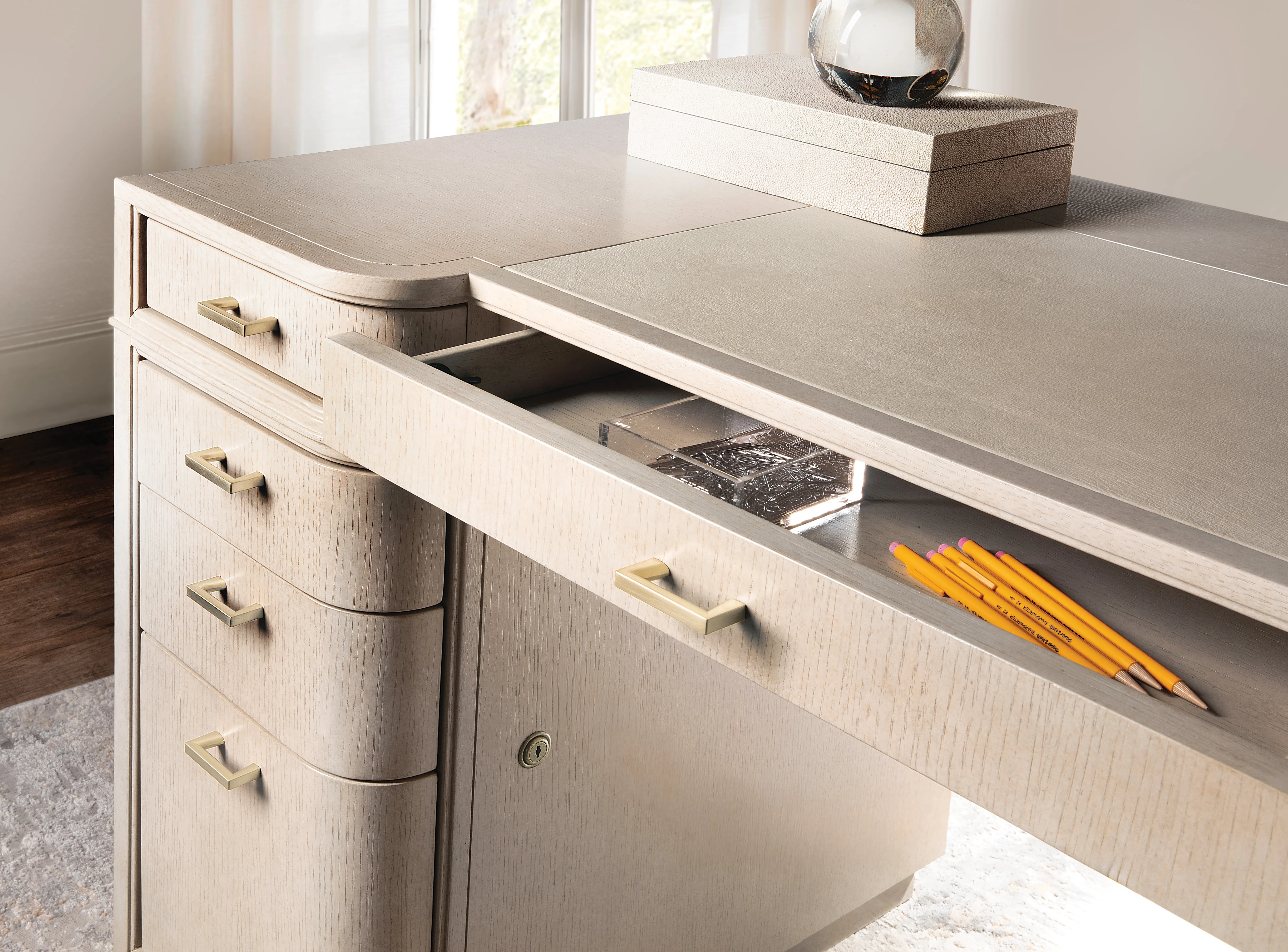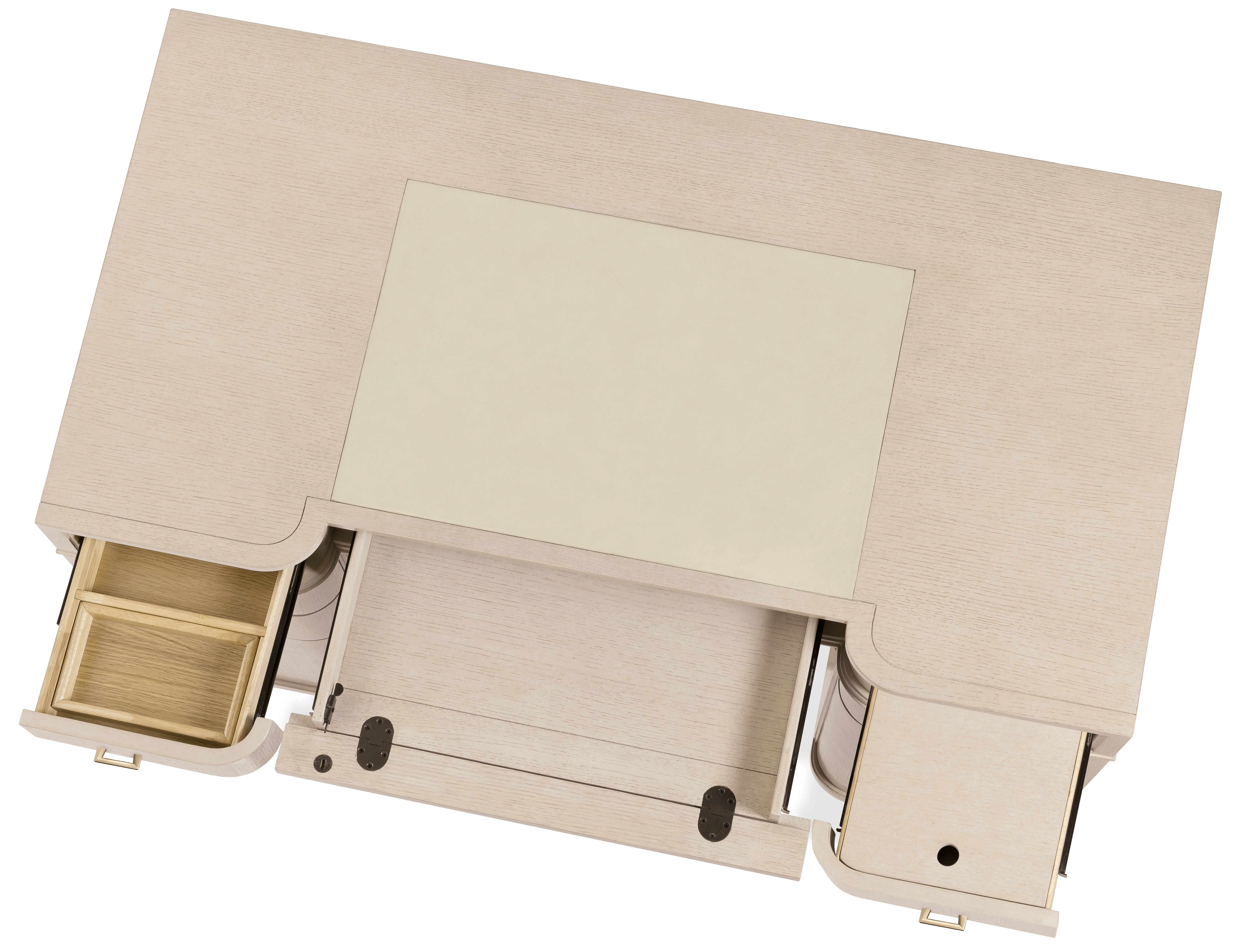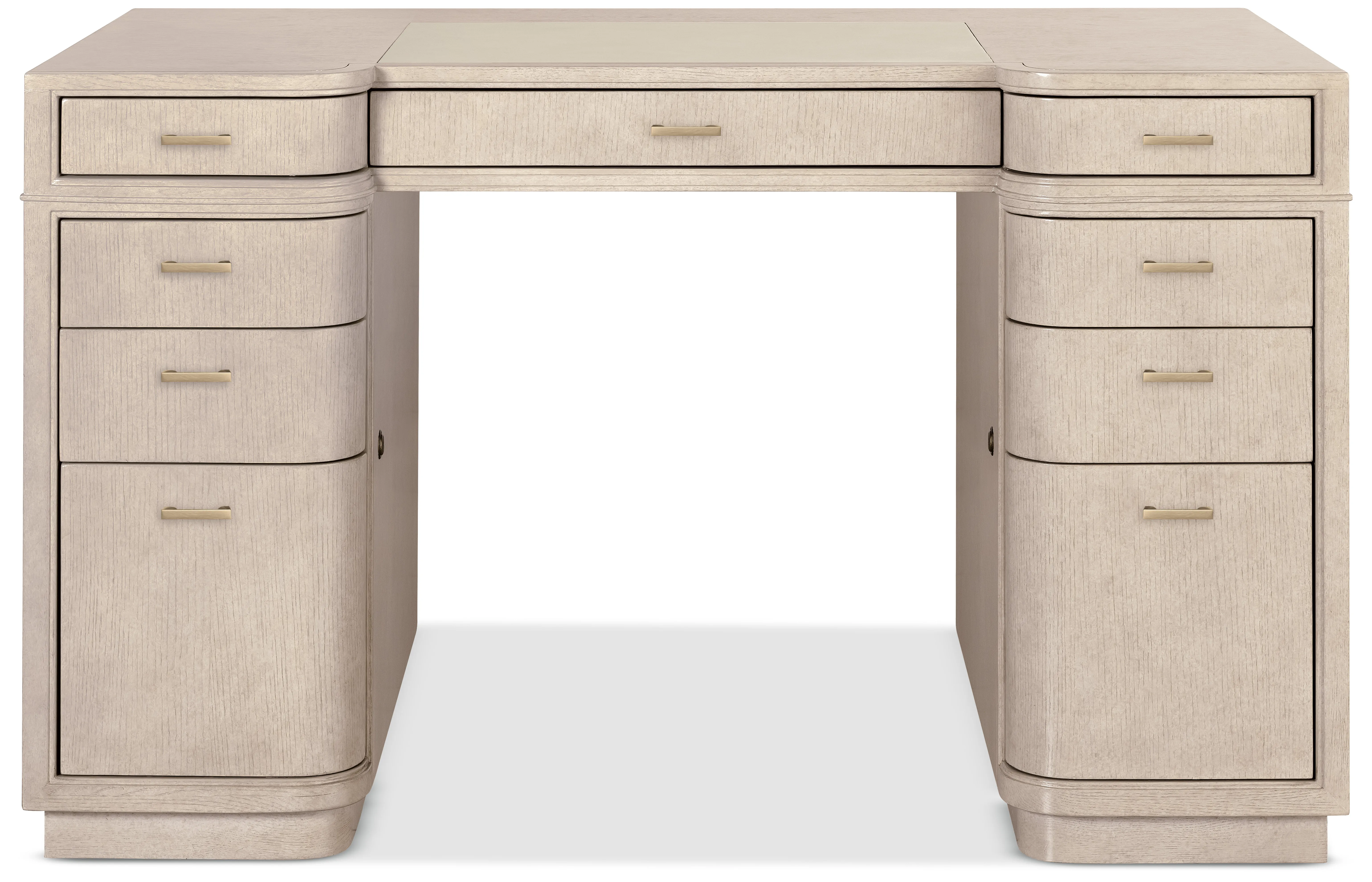 Designed for serious work and elevated style, the Marlowe Knee-Hole Desk pairs a sleek profile with a top-grain leather writing surface. Nine drawers, including a drop-front keyboard drawer, removable organizers, and locking file storage, deliver exceptional function. This luxury executive desk in Polished Limestone oak is a standout transitional office desk for designers or discerning home offices.