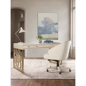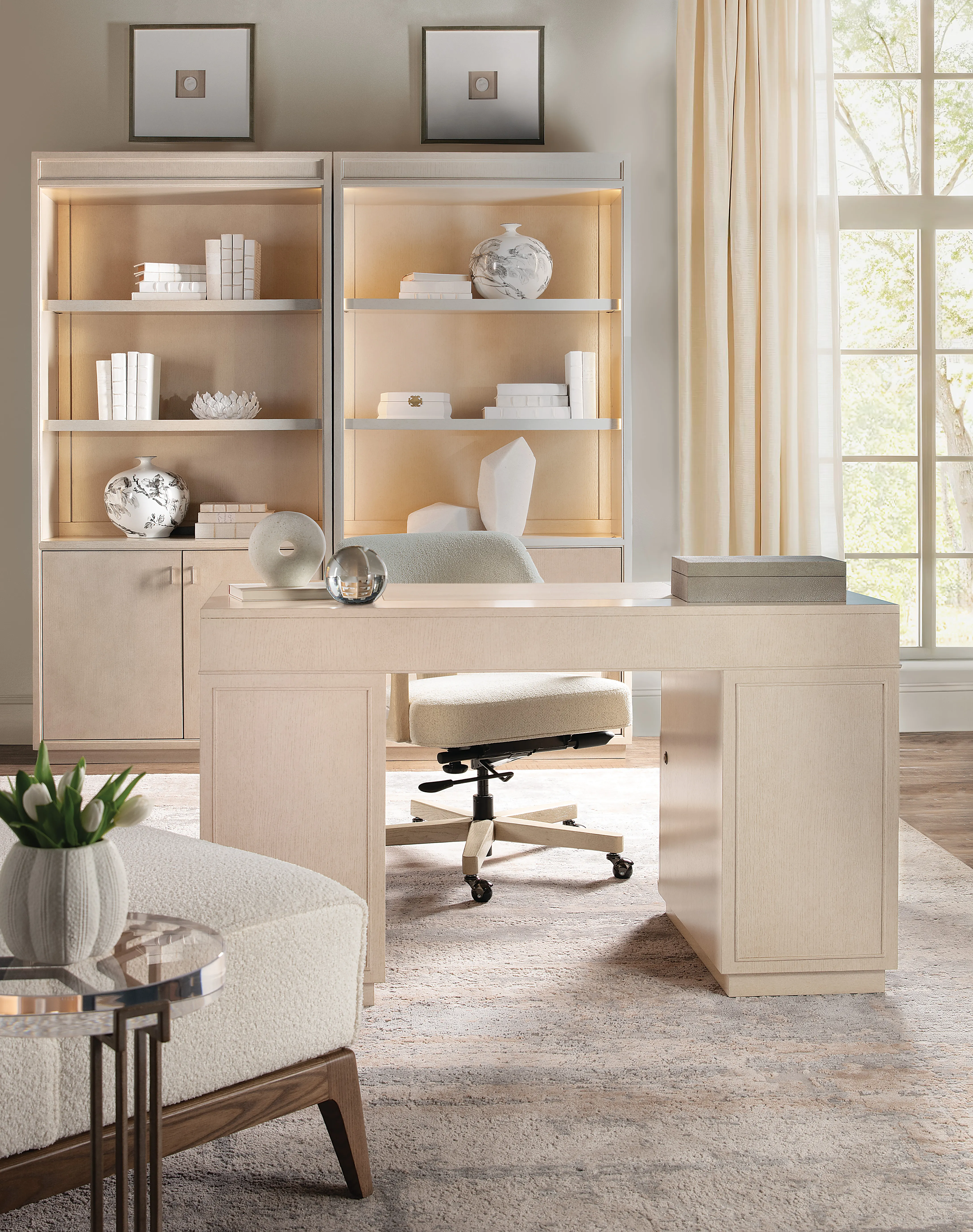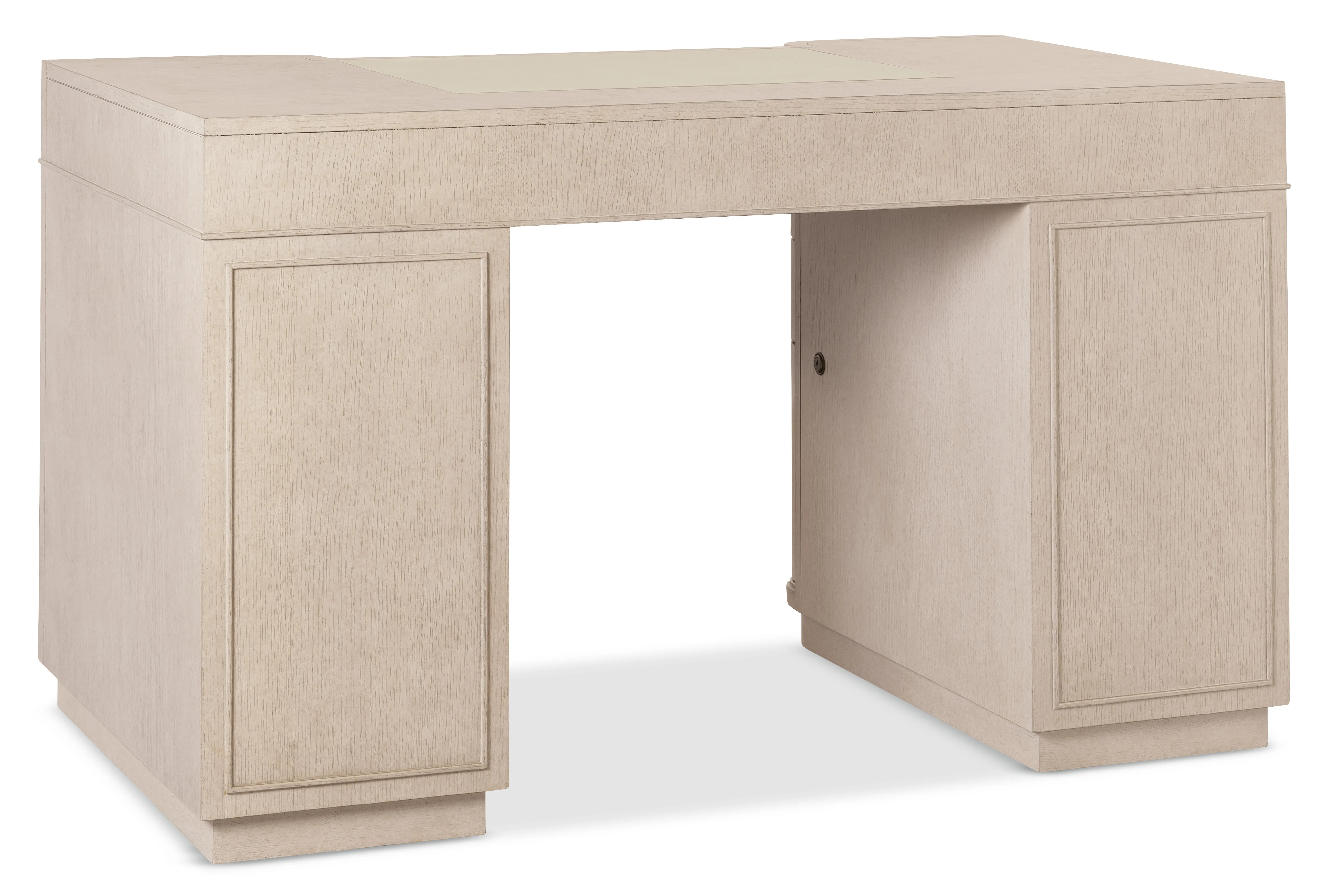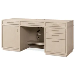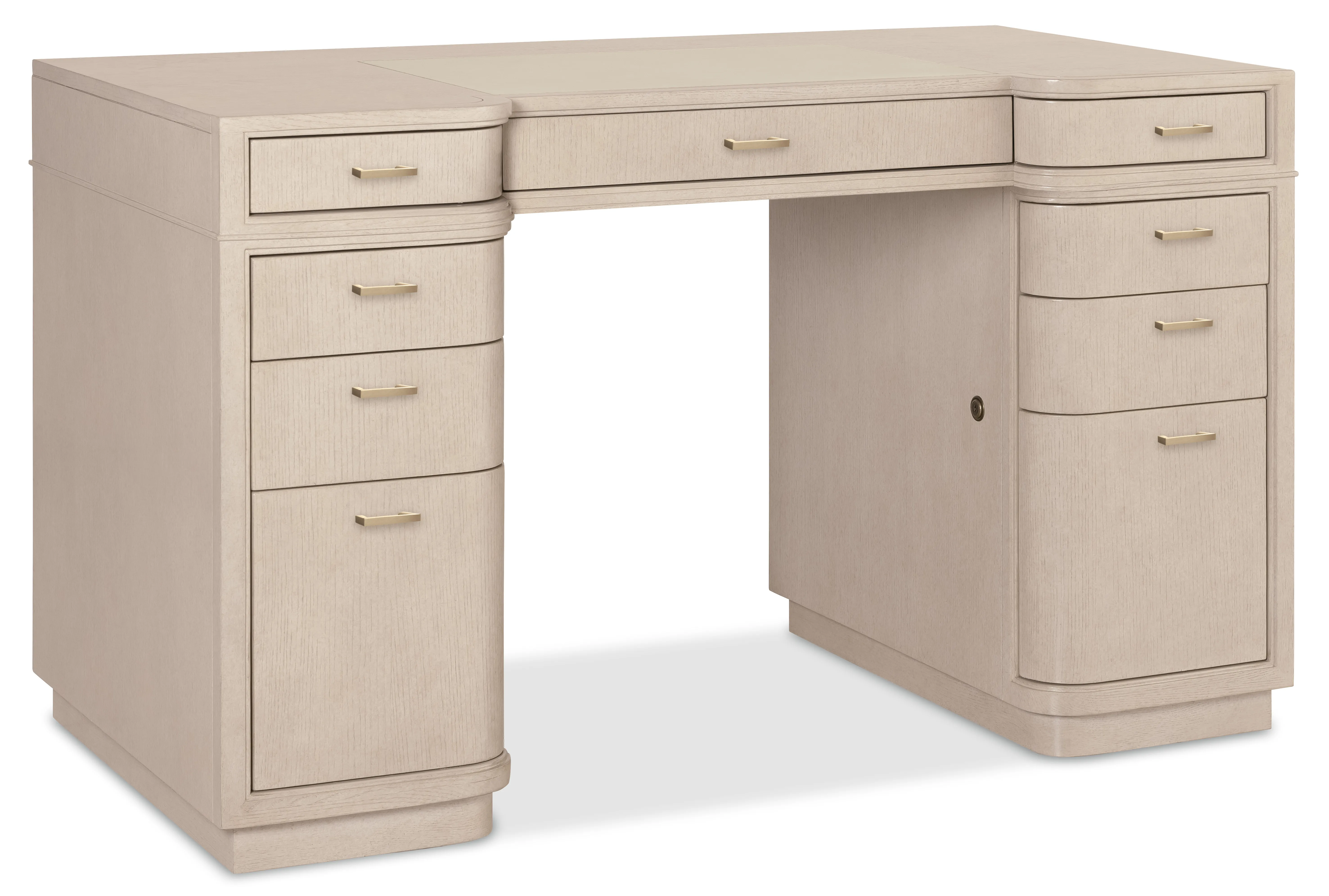Designed for serious work and elevated style, the Marlowe Knee-Hole Desk pairs a sleek profile with a top-grain leather writing surface. Nine drawers, including a drop-front keyboard drawer, removable organizers, and locking file storage, deliver exceptional function. This luxury executive desk in Polished Limestone oak is a standout transitional office desk for designers or discerning home offices.