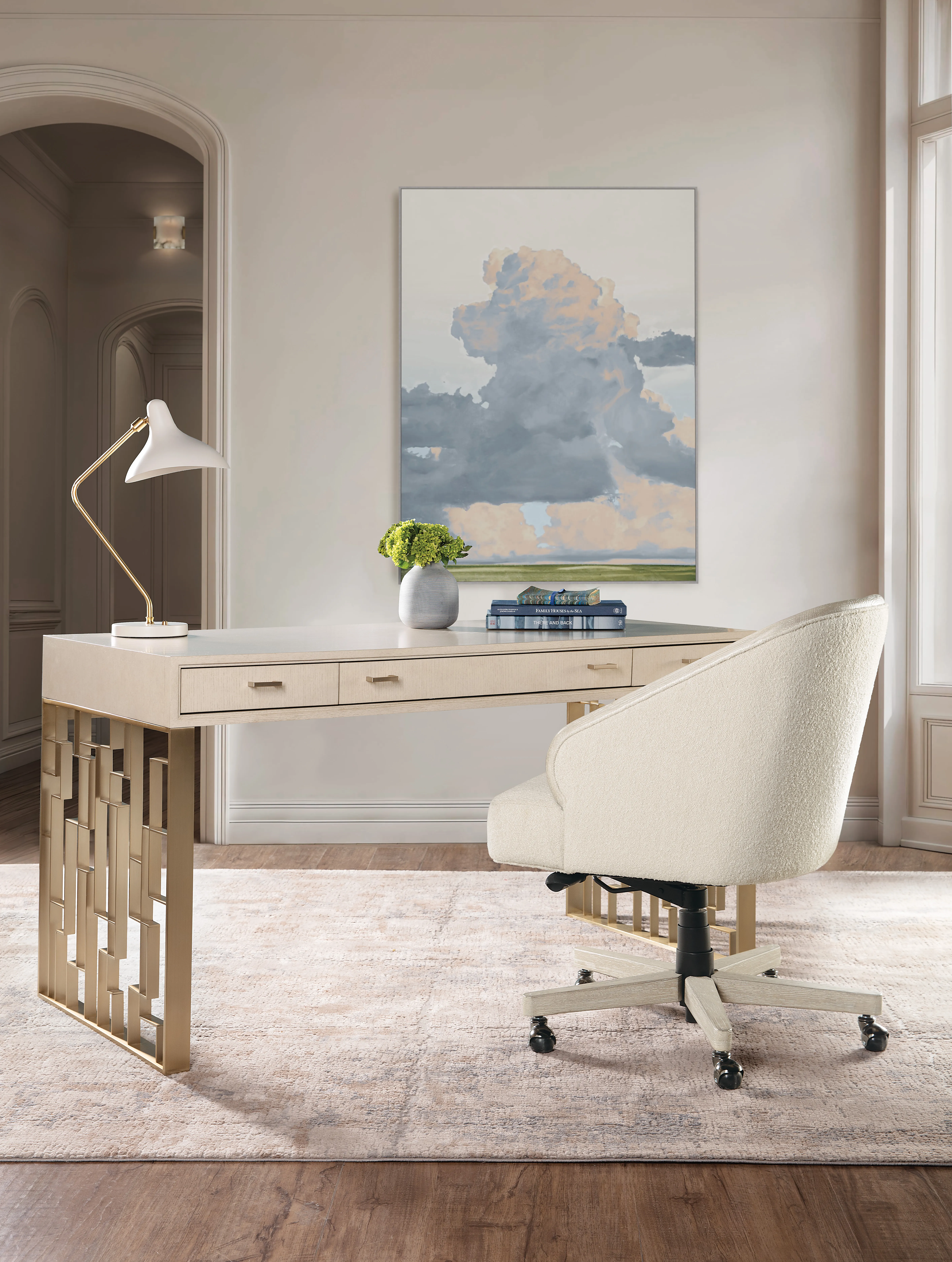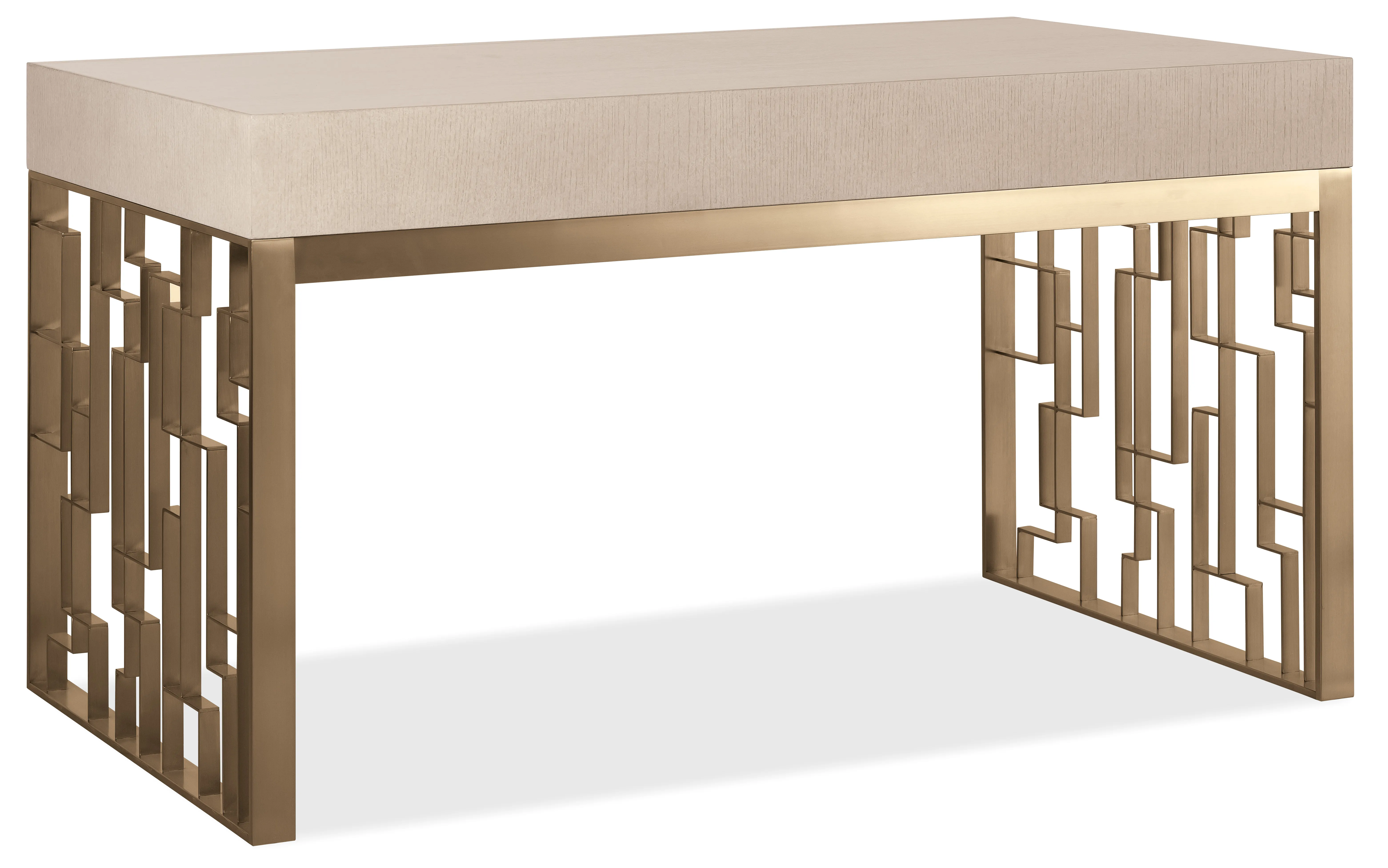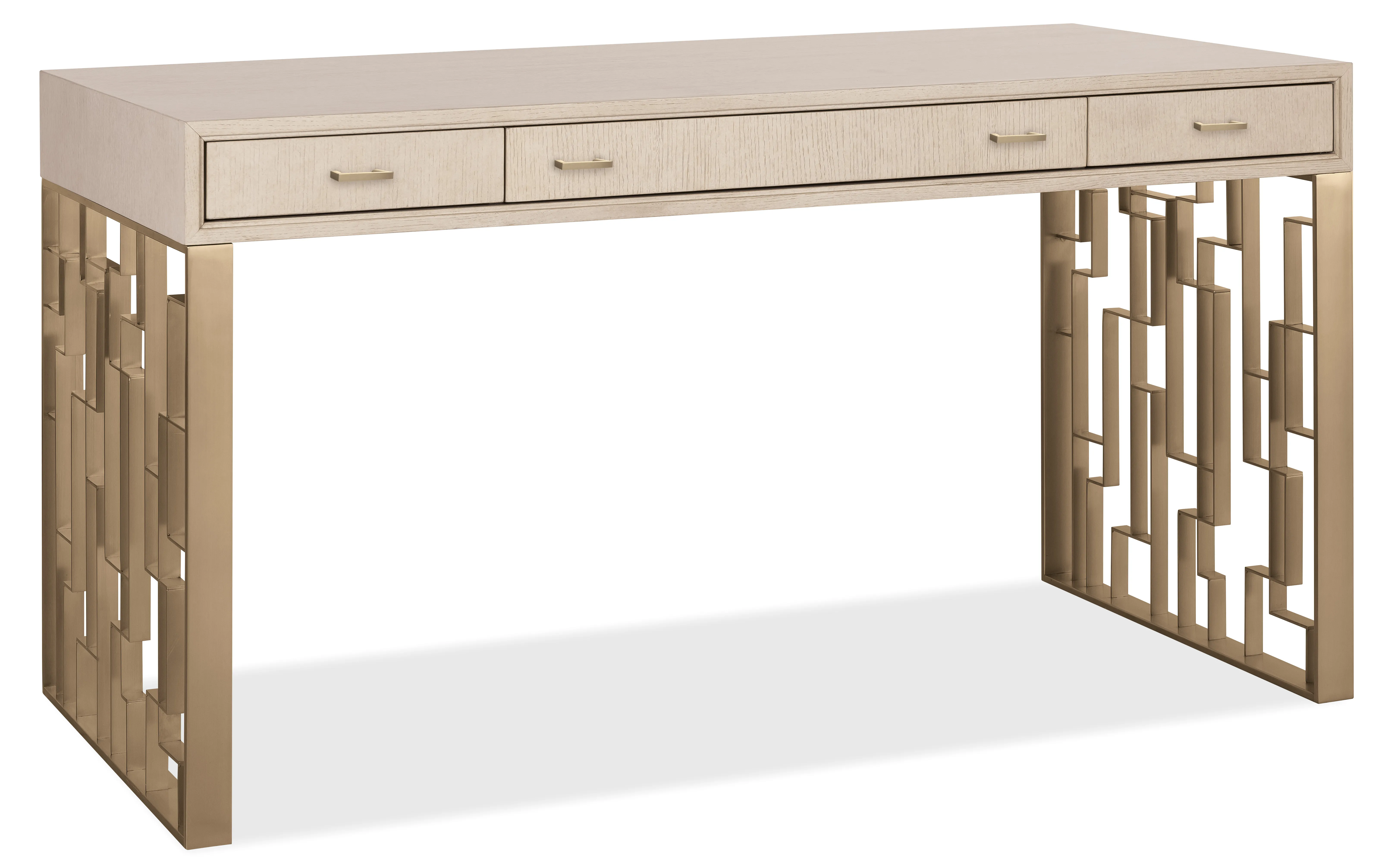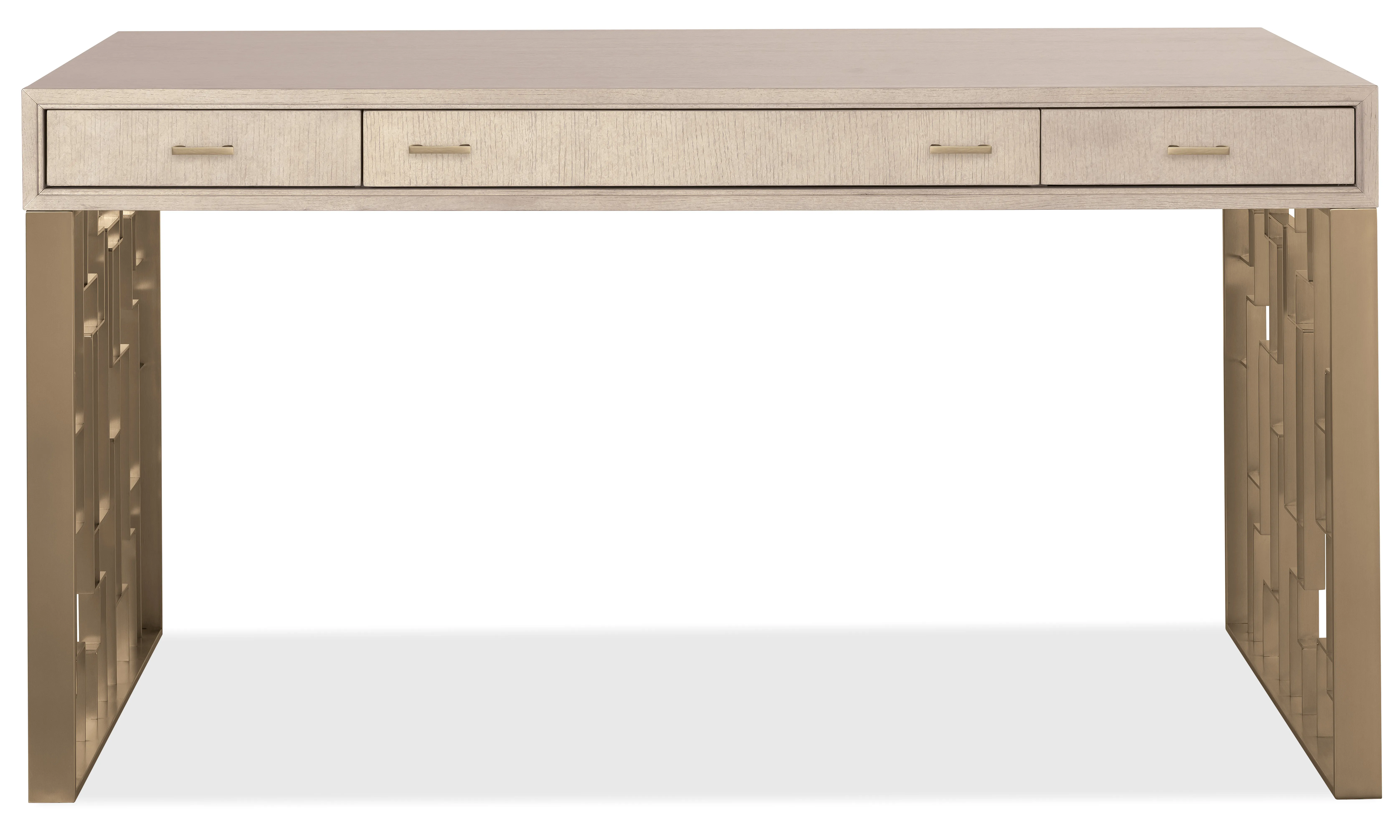Streamlined yet storage-savvy, the Marlowe Writing Desk is a sophisticated light wood writing desk with designer detailing. Three drawers offer smart organization, including a drop-front keyboard drawer, removable partitions, and a sliding writing tablet. Finished in Polished Limestone with geometric metal leg panels, it’s a versatile transitional home office desk for compact or open spaces.