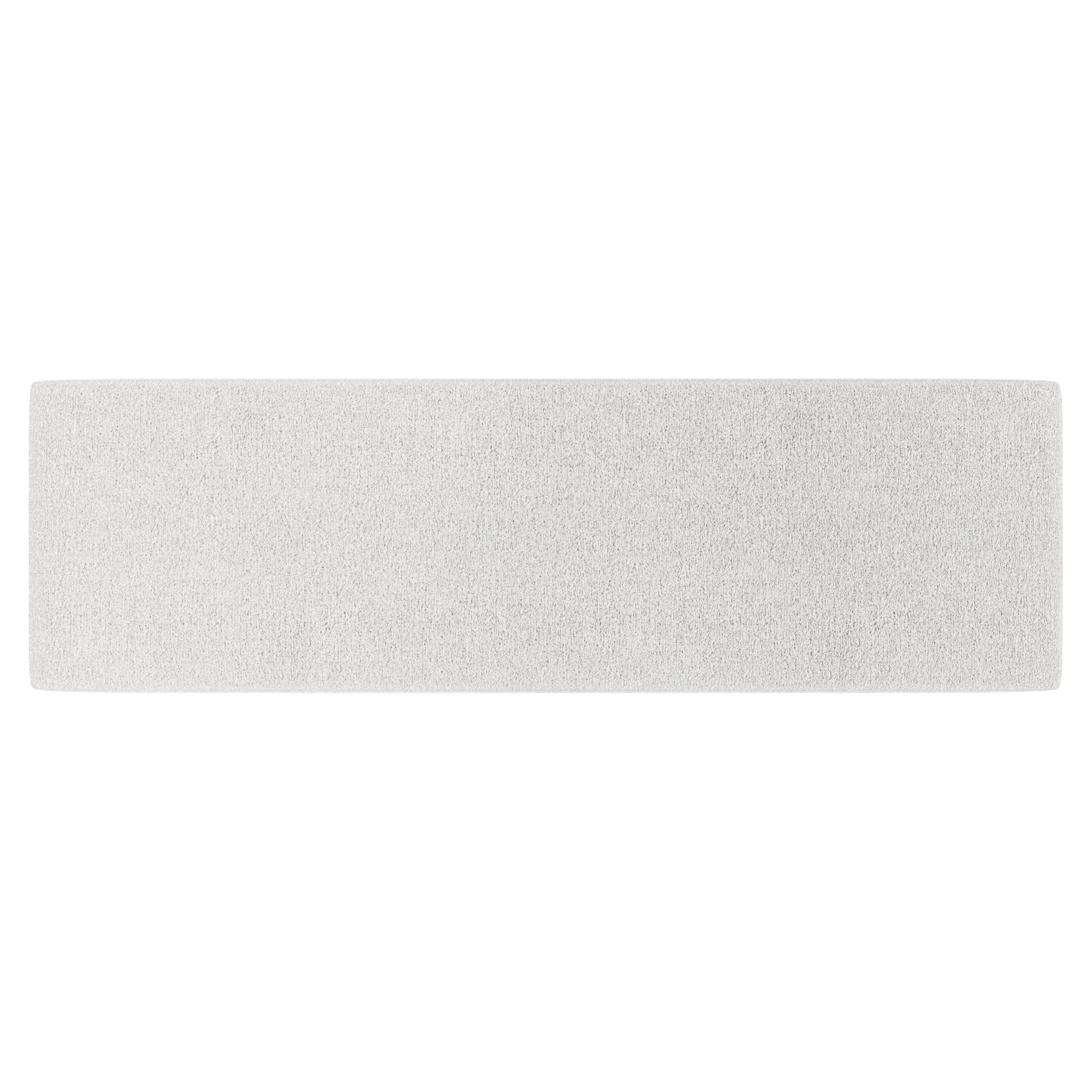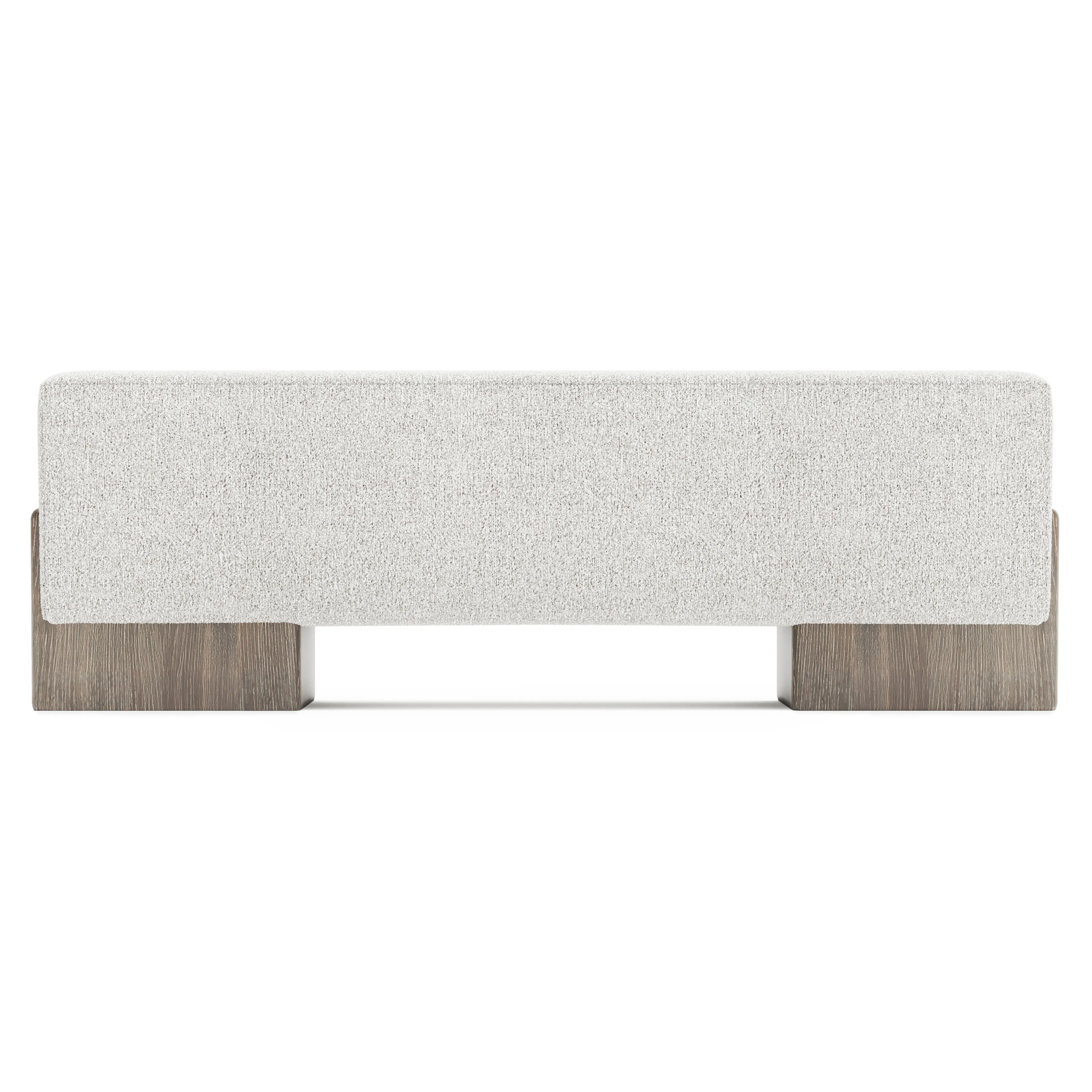 Two wood base panels cradle a deep upholstered seat, giving the Monolith bench a bold design. The textured base panels extend up the sides of the seat in wirebrushed white oak in Puma finish.