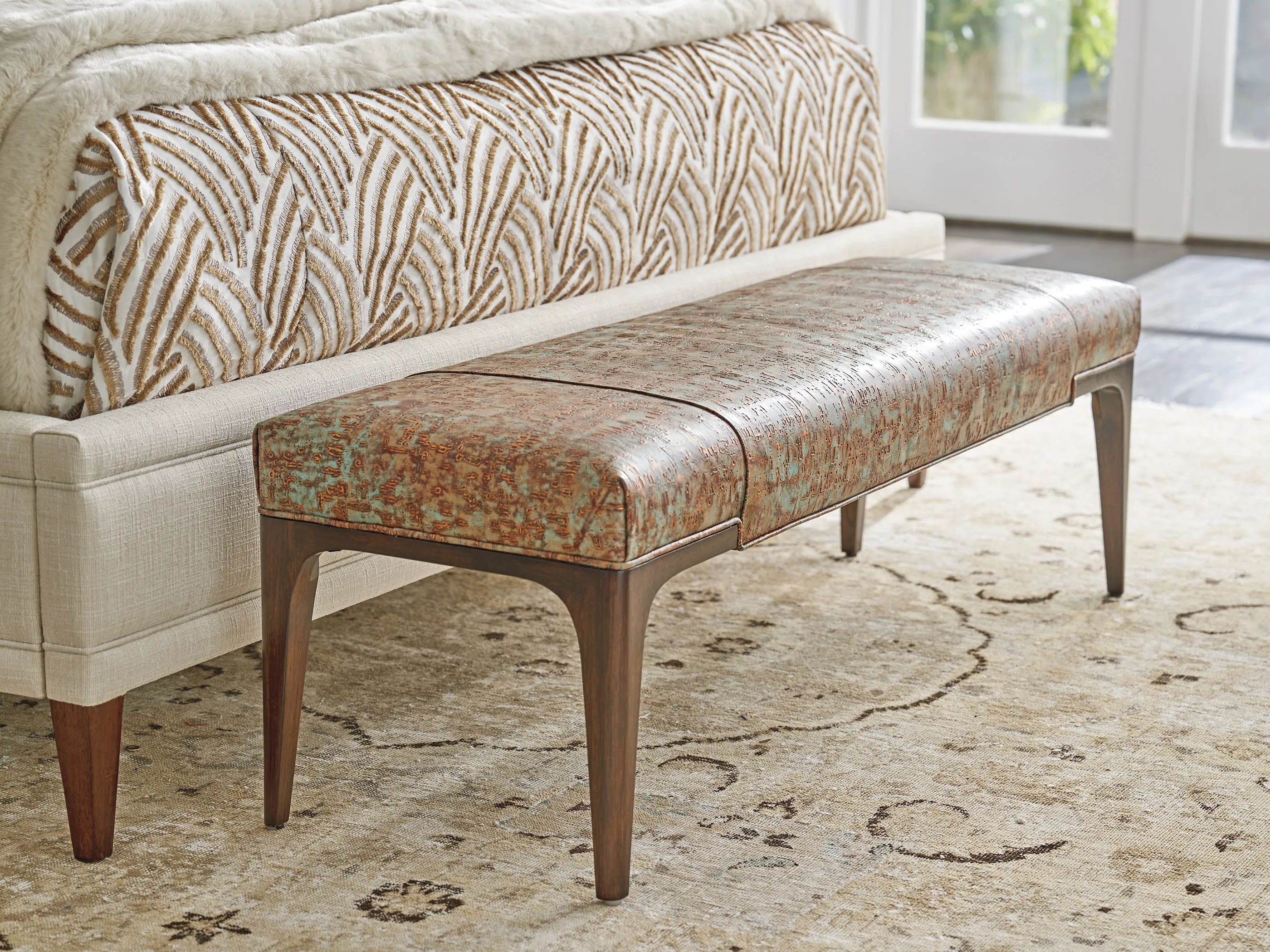 The Saville bench features overlay tailoring on the seat cushion, highlighted by perimeter welting, and elegant tapered legs. The design is available in leather and in custom wood finishes.
