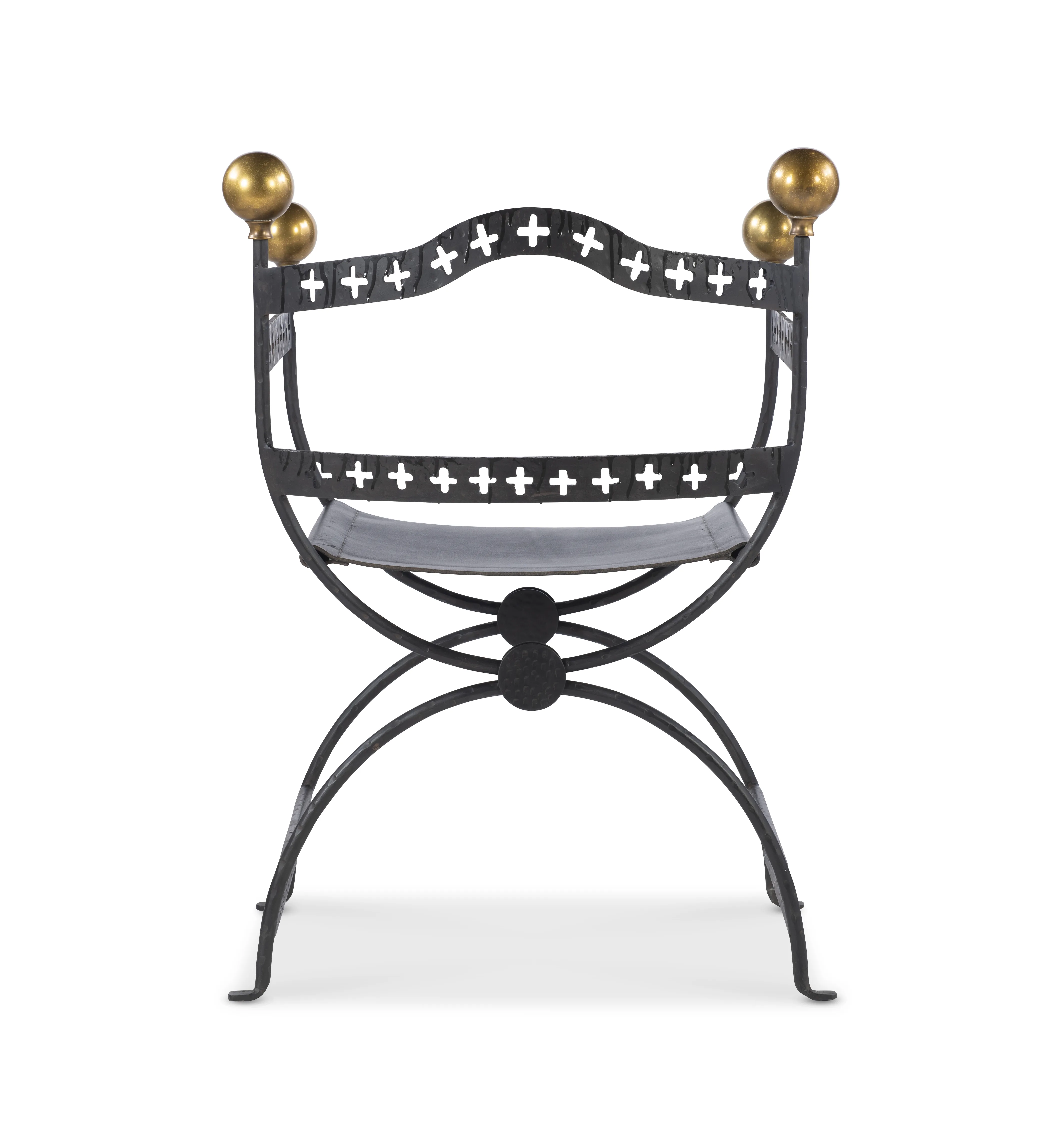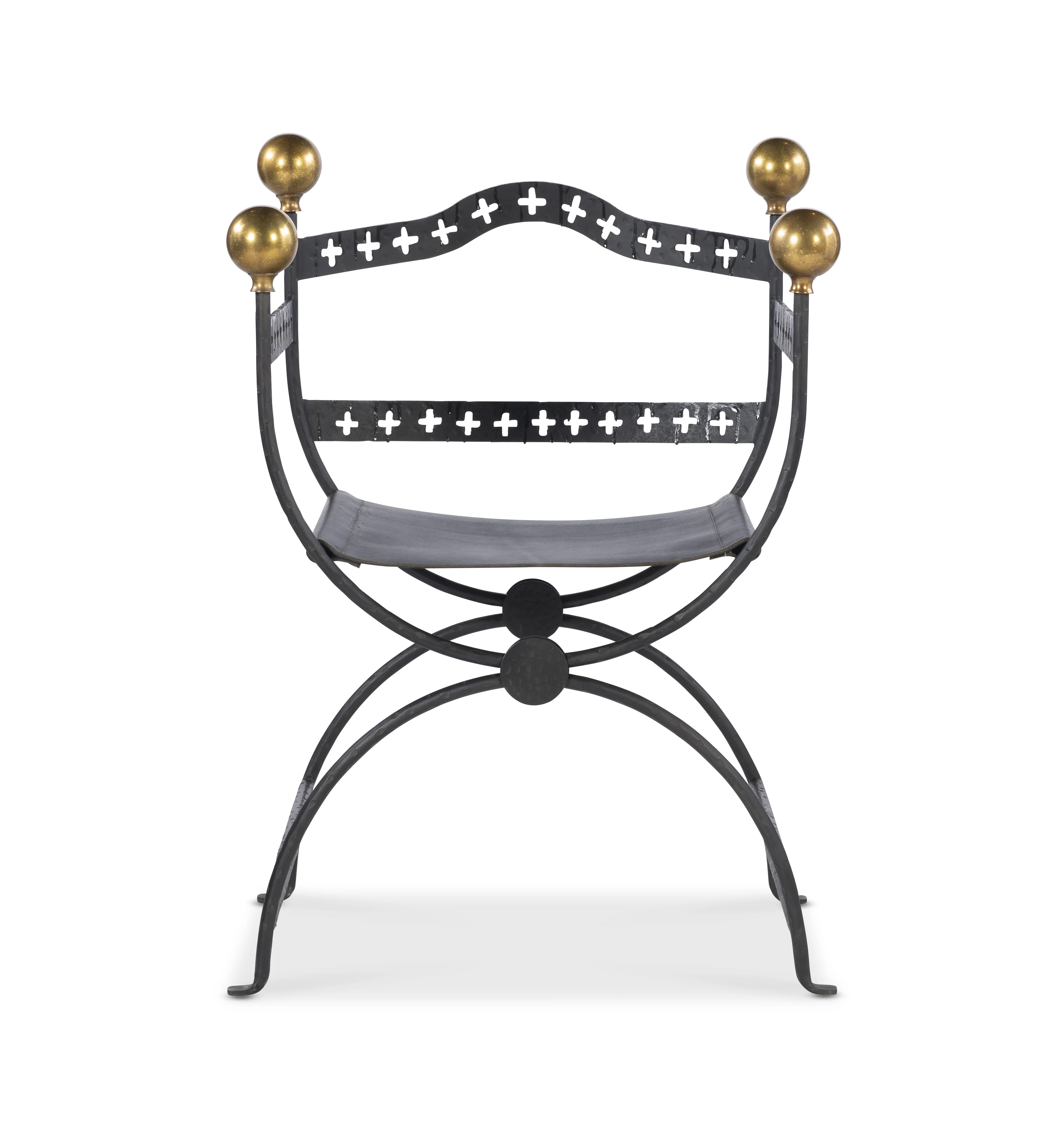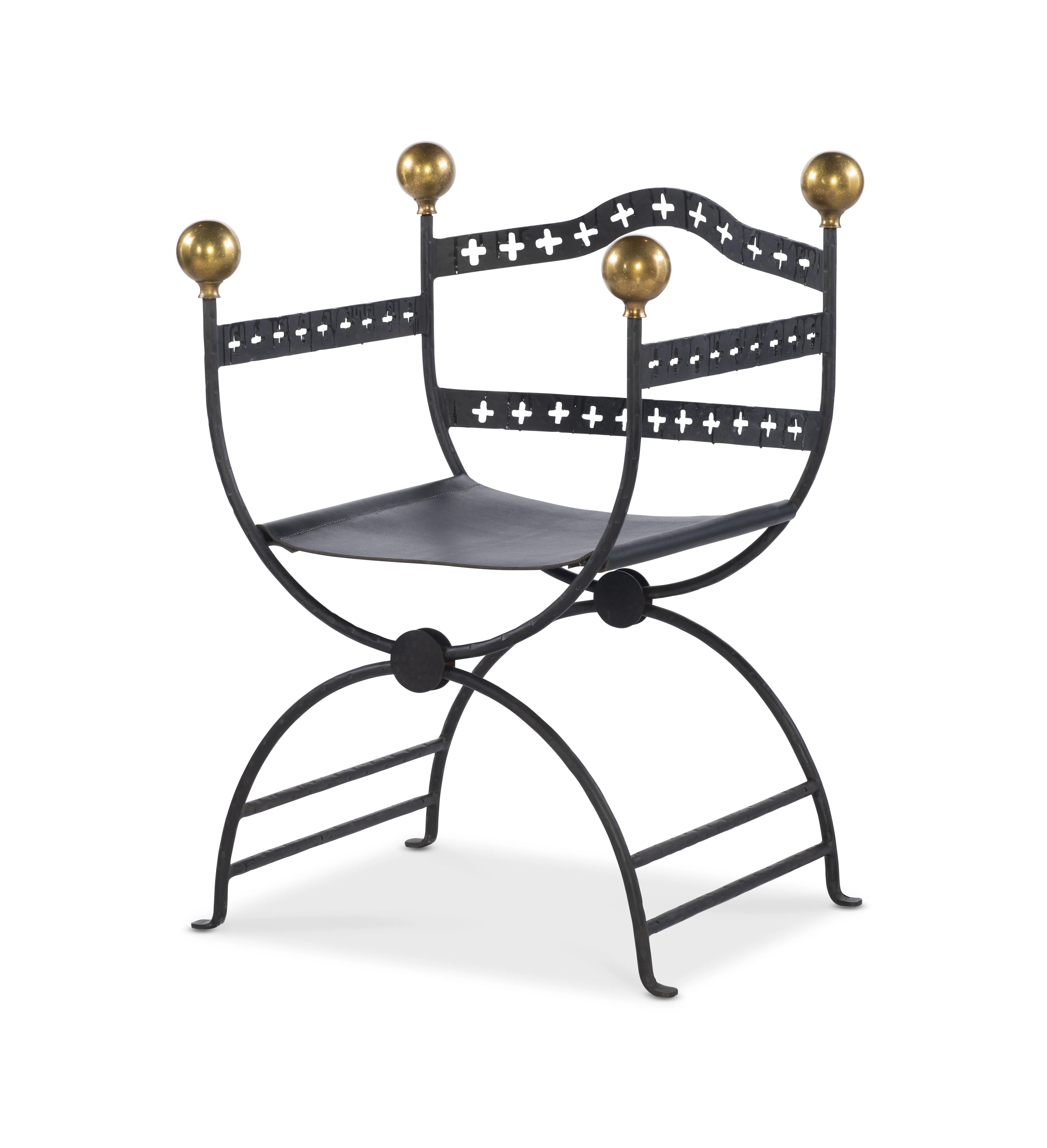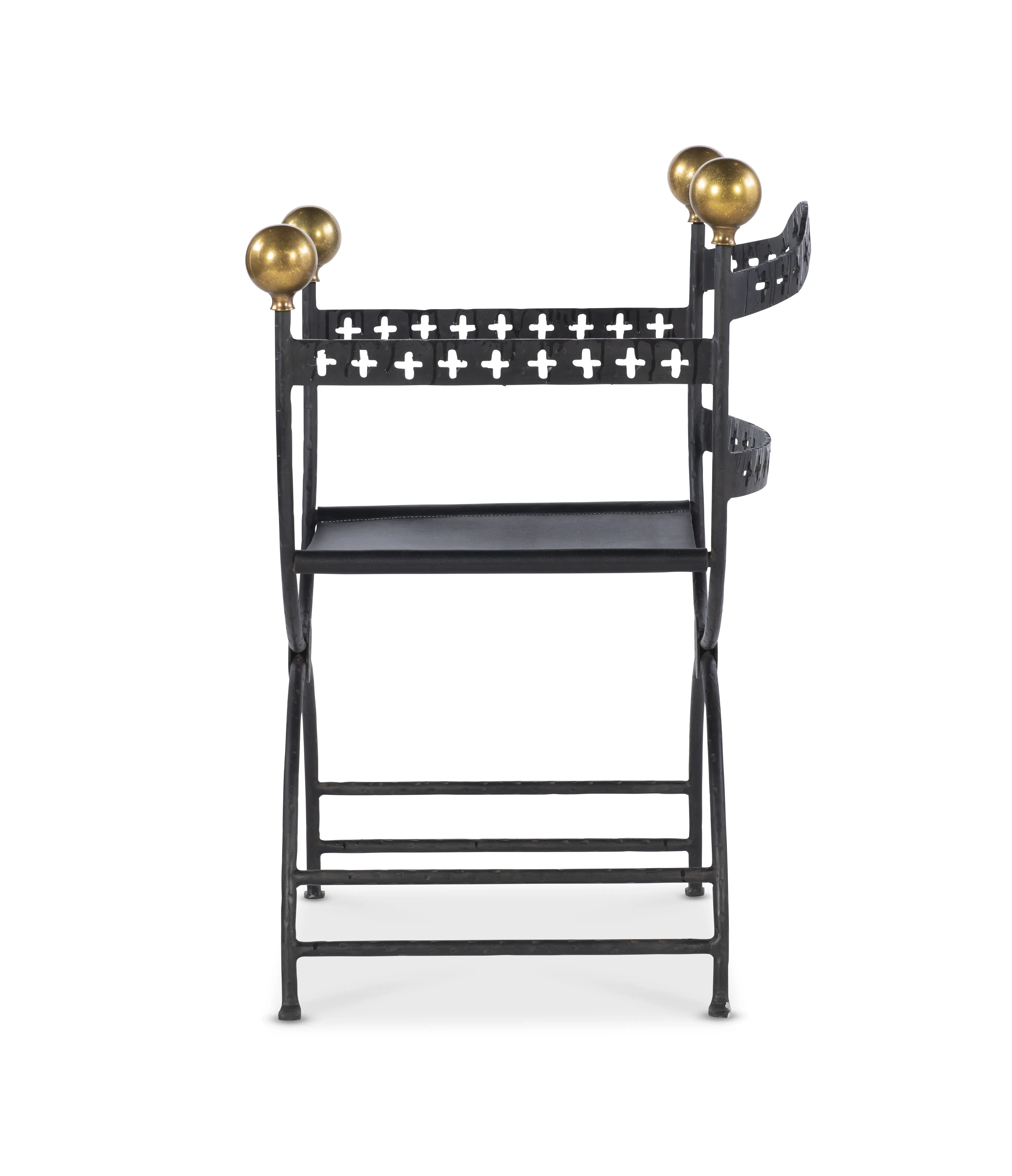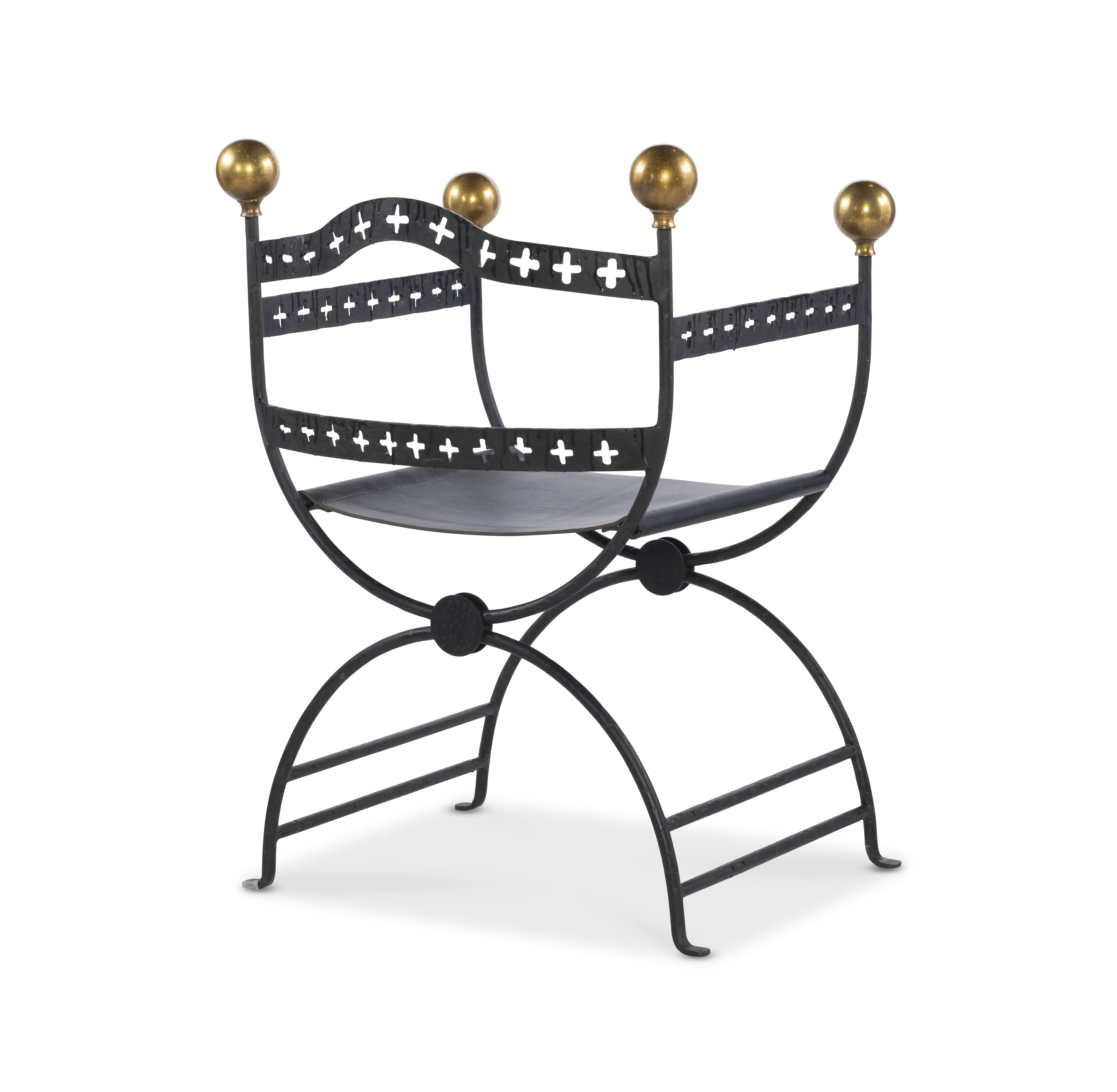 Rediscover the timeless allure of the Savonarola chair with our mid-centuryinterpretation, blending historical elegance with modern sophistication. Hand craftedfrom blackened iron with brass ball finials, this chair features the signature X-shaped frame that characterizes the Savonarola design, a symbol of strength and stability. The gently curved backrest and black leather seat are meticulously detailed to provide both comfort and style, reflecting the craftsmanship of the mid-century era.