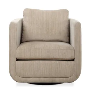Casual shelter arm accent chair tailored in a woven linen blend fabric in natural stone hues, featuring a flanged edge trim complete with a loose back pillow. Rests on a solid birch wood swivel base, finished in a weathered gray stain.