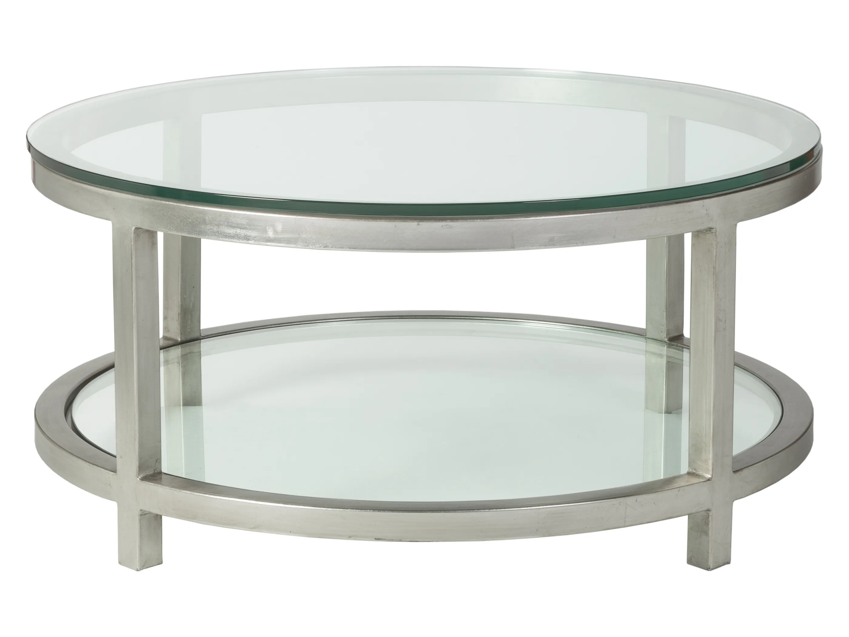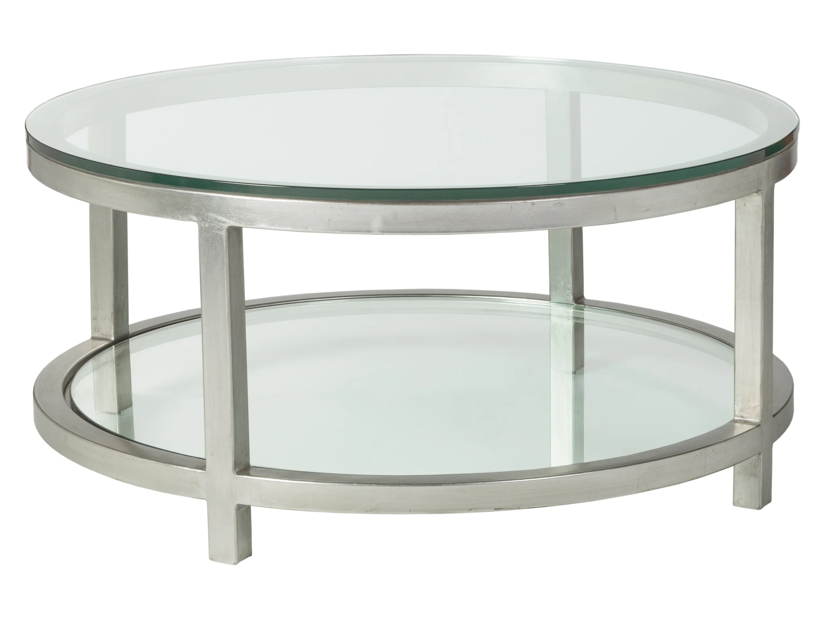 Tubular steel frame, glass top with flat polished edges, and inset glass shelf. Shown in true silver leaf with antiqued effect, but also available in all Artistica Metal Designs finishes.