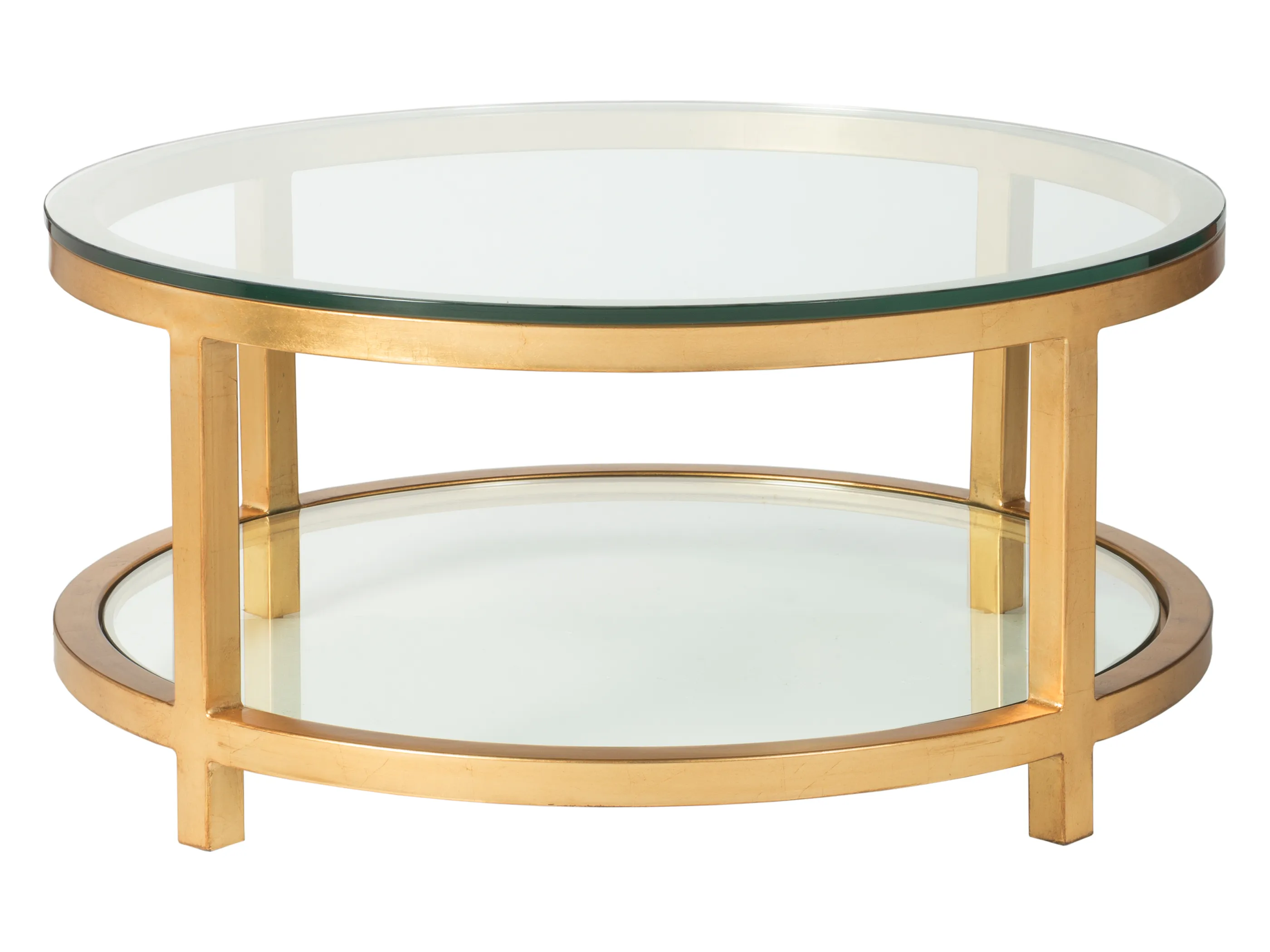 Tubular steel frame, glass top with flat polished edges, and inset glass shelf. Shown in true gold leaf with antiqued effect, but also available in all Artistica Metal Designs finishes.