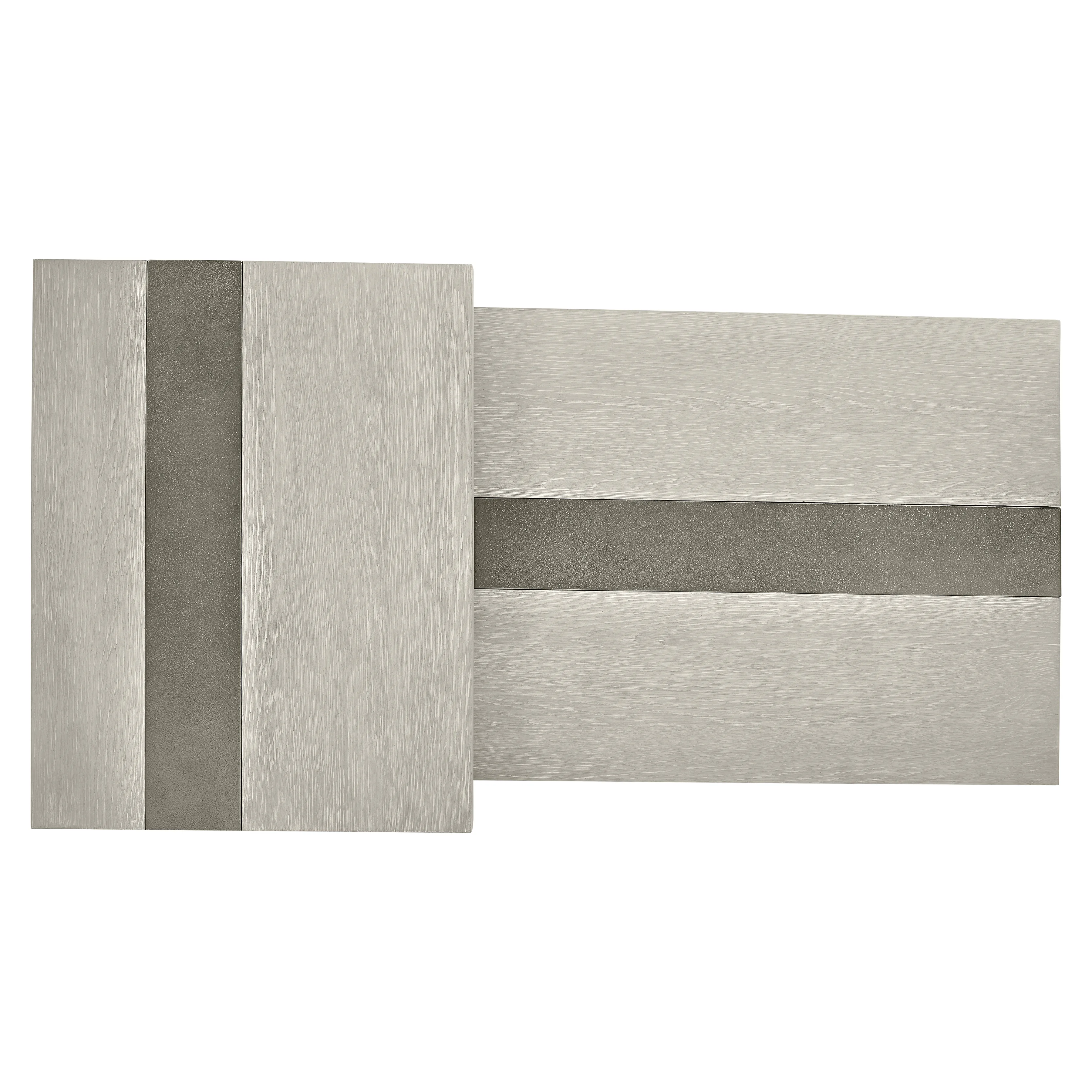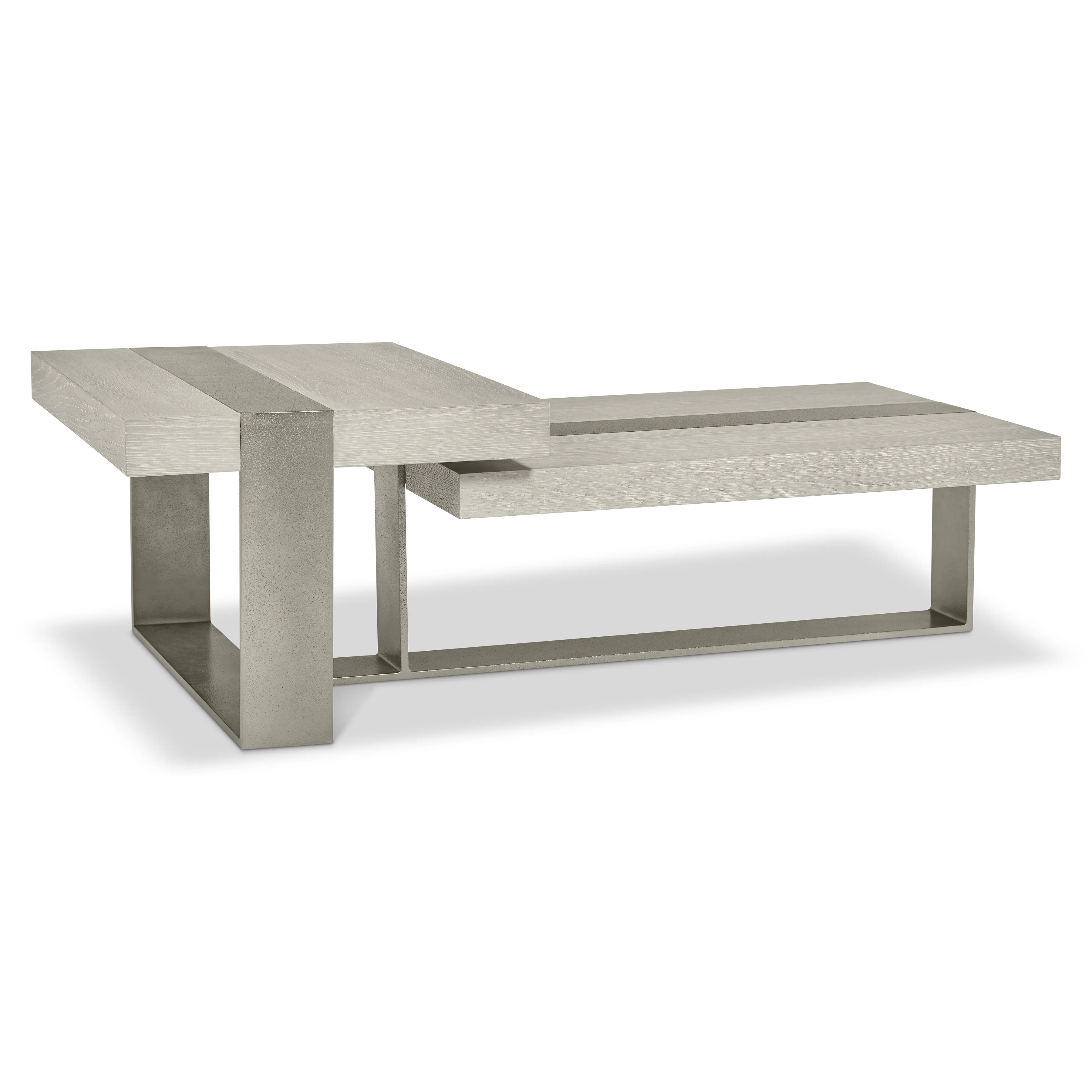 Cocktail Table with Wirebrushed Oak tops in Larza finish. Sandblasted Aluminum base in Satin Nickel finish. Adjustable glides.