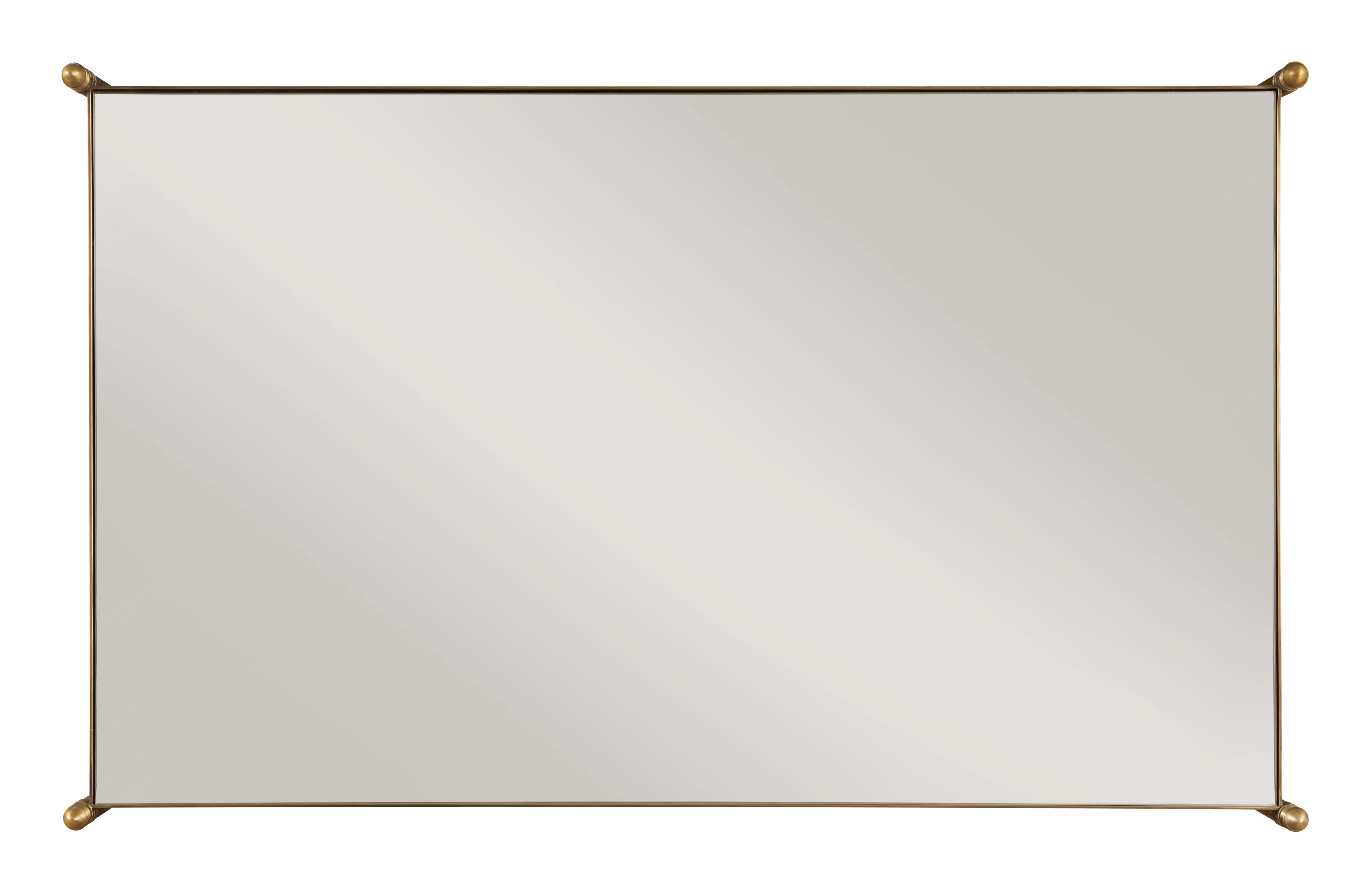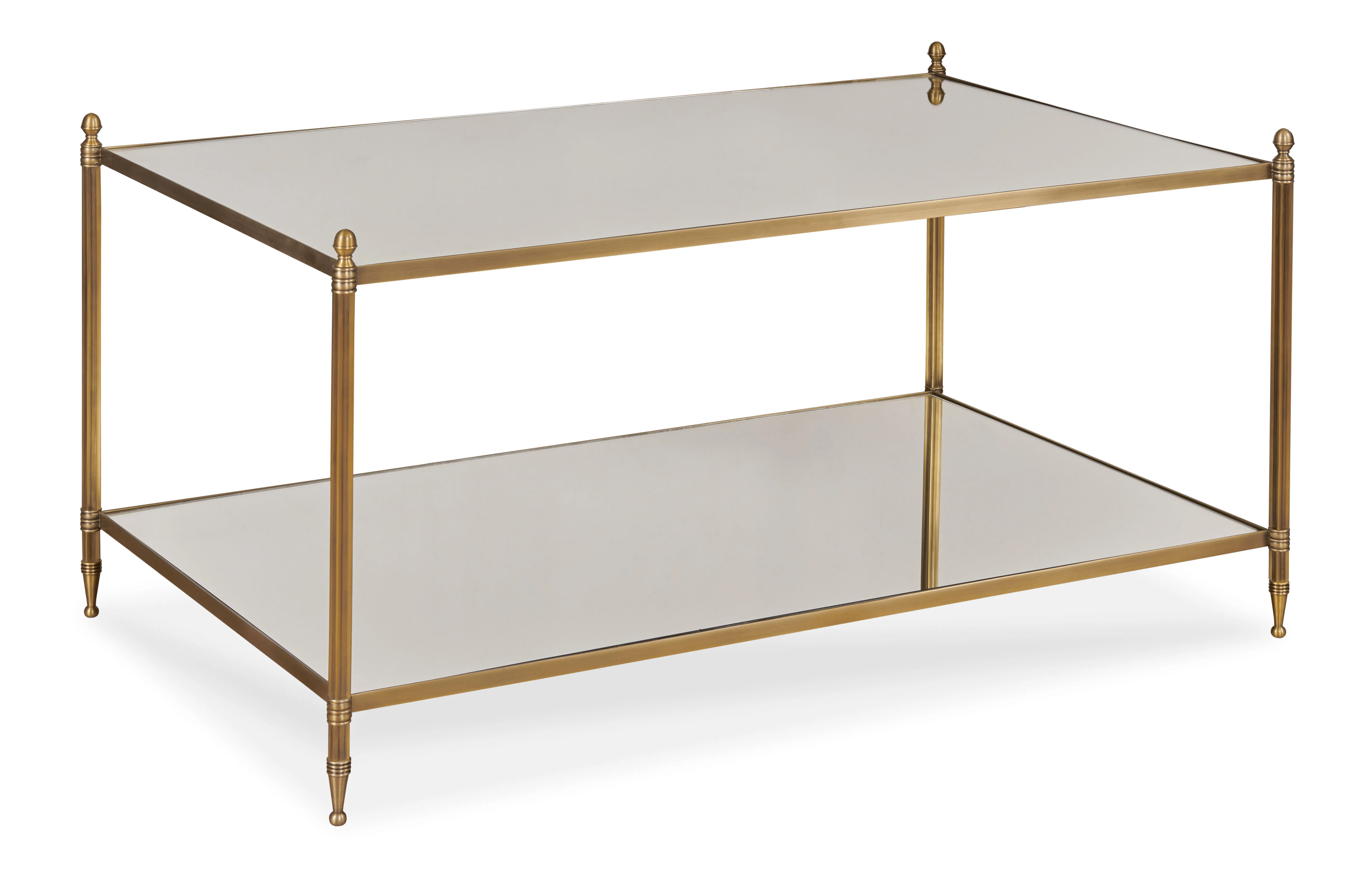 Odesa is an elegant cocktail table made from antique brass with a mirrored top and lower shelf. The delicately scaled posts end in a decorative, tapered foot and acorn designed finial.