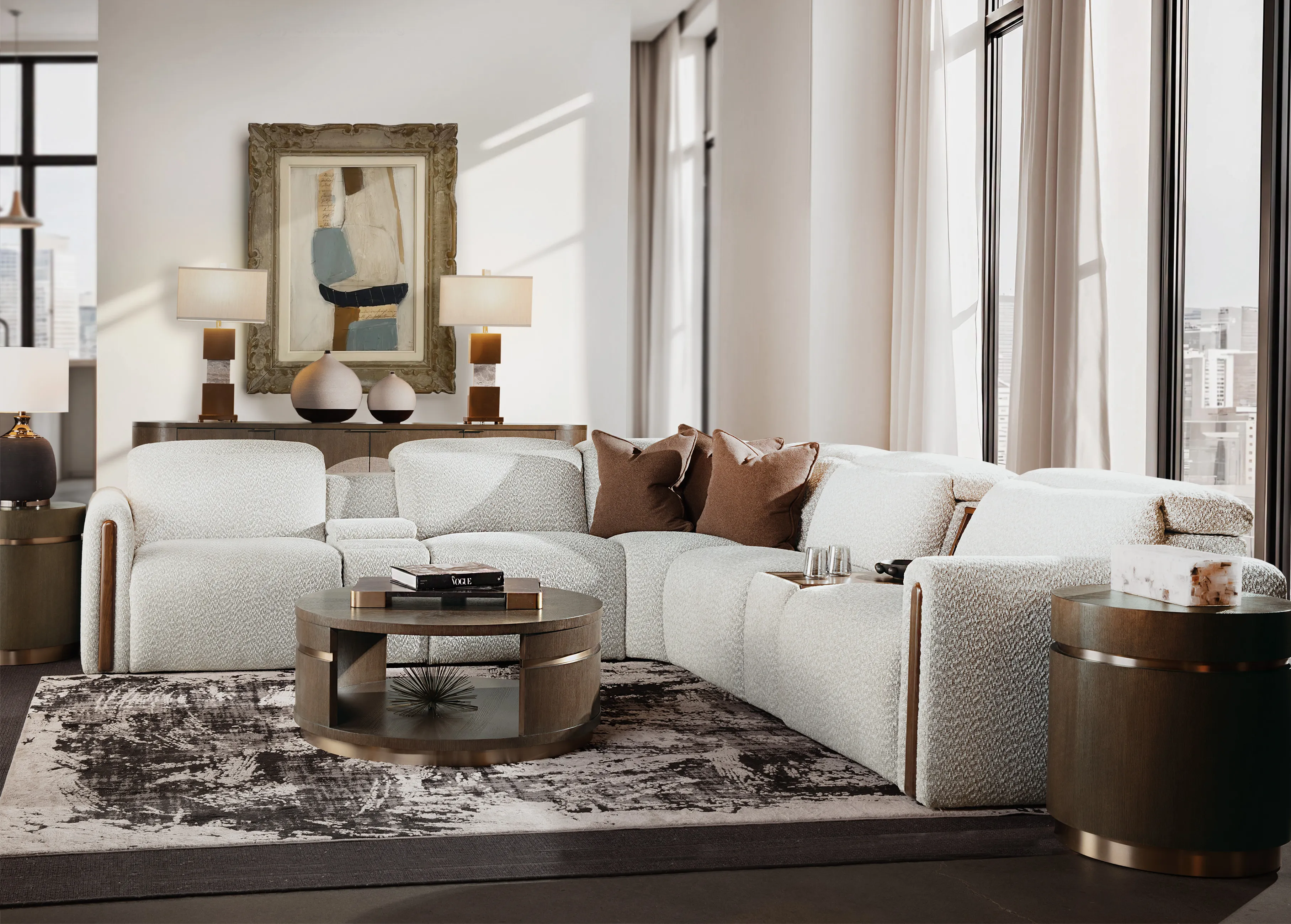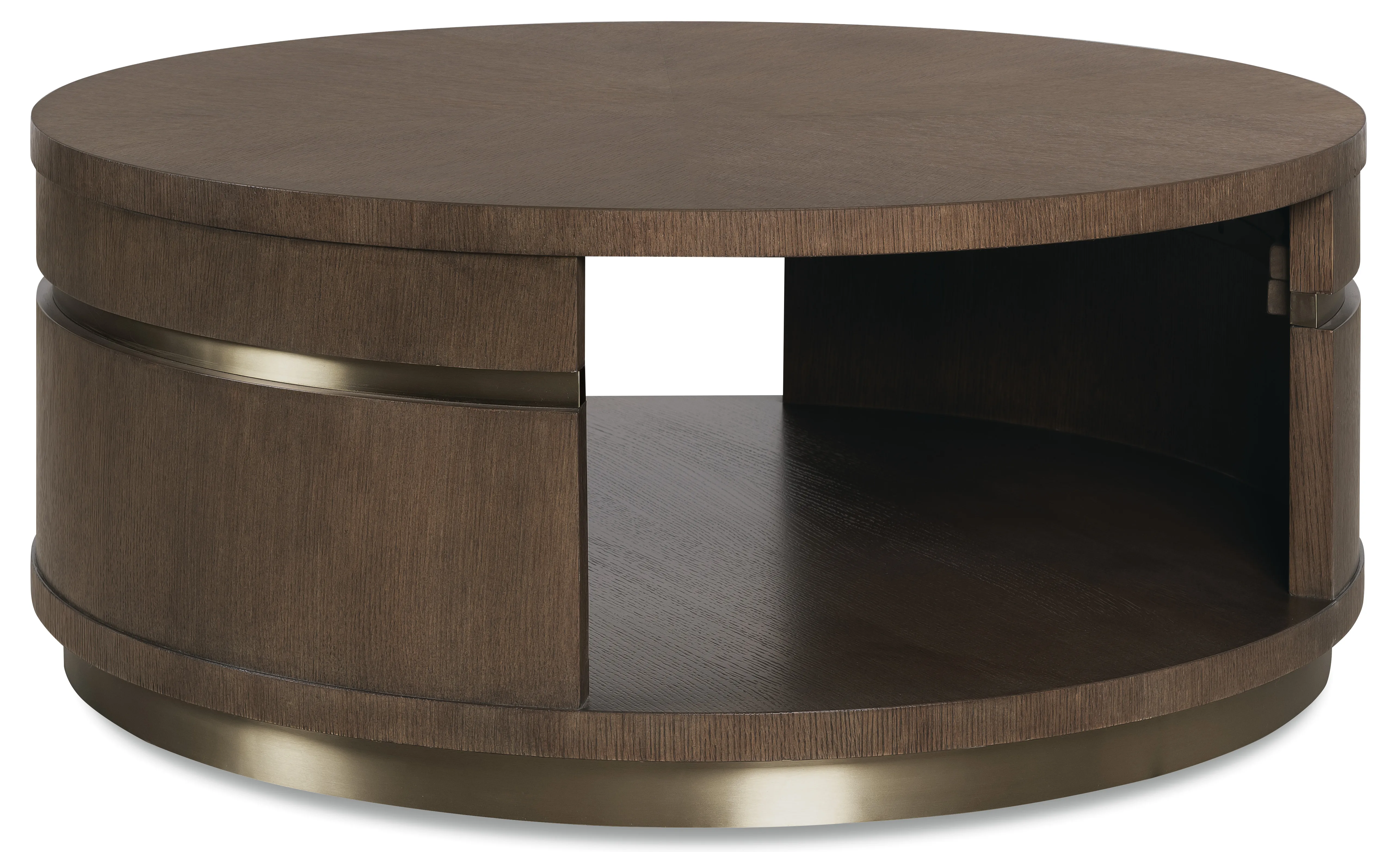 Add sculptural function to your living space with the Roll With It Round Cocktail Table, a sleek round wood coffee table in a rich dark finish. Crafted of white oak veneers with champagne-tone metal trim, it features an open storage well and grounded plinth base, perfect for a transitional cocktail table that keeps styling light but practical.