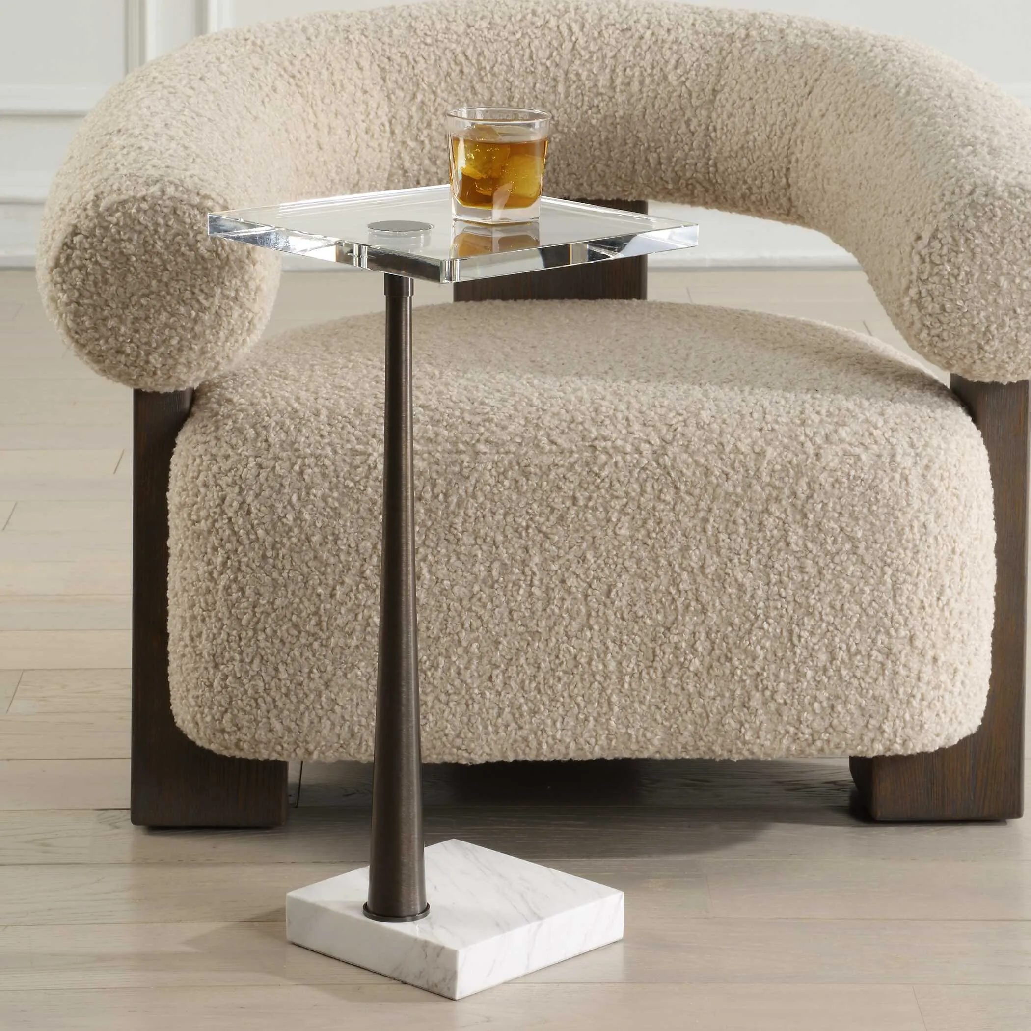 This Drink Table Is A Testament To Refined Craftsmanship, Blending Natural Materials Like Marble And Metal To Create An Eye-catching Piece. Its White Marble Foot With Subtle Gray Veining Is Paired With A Thick Crystal Table Top, All Connected By A Tapered Metal Base In Black. True To The Nature Of Natural Materials, Each Piece Will Have Unique Marbling And Veining Throughout.