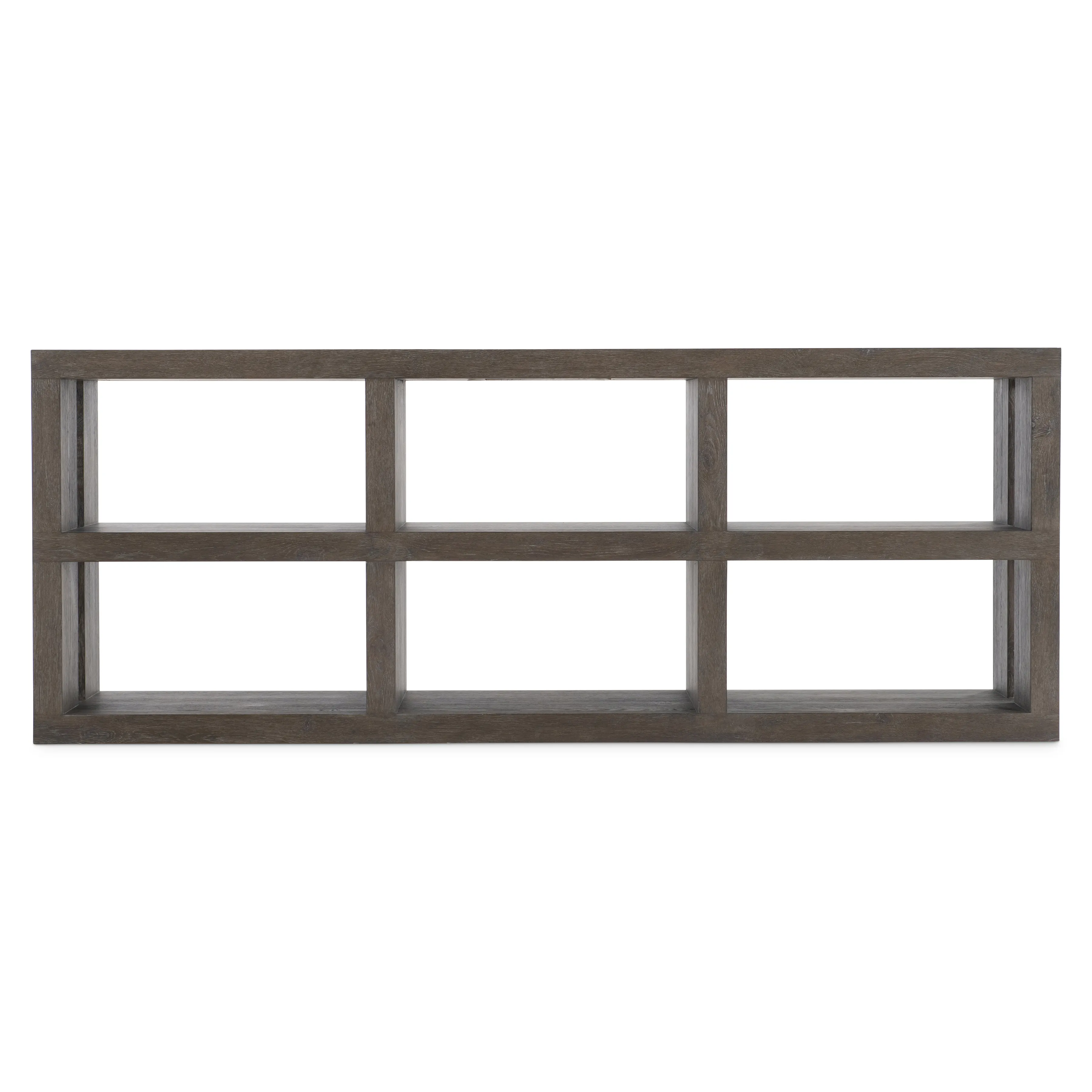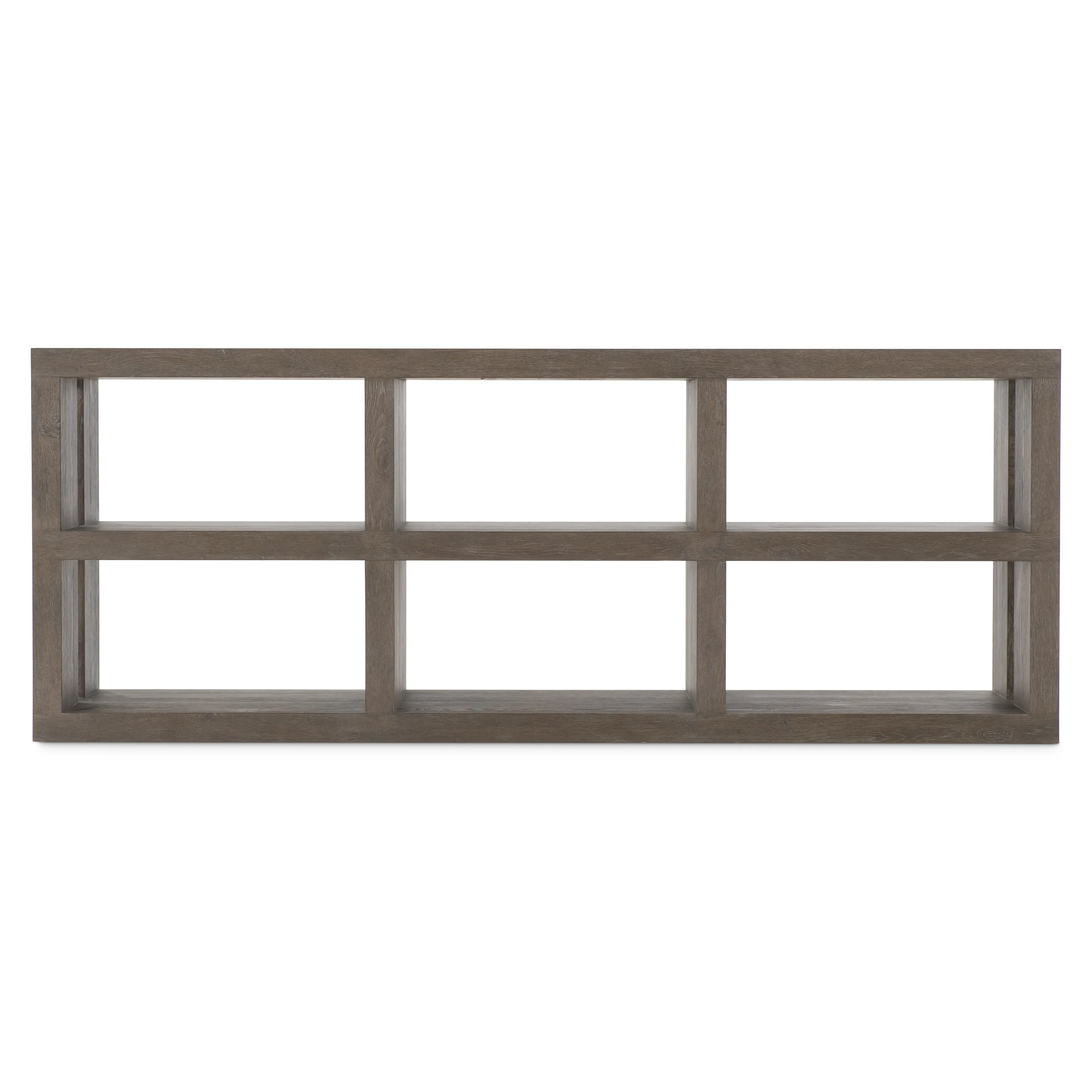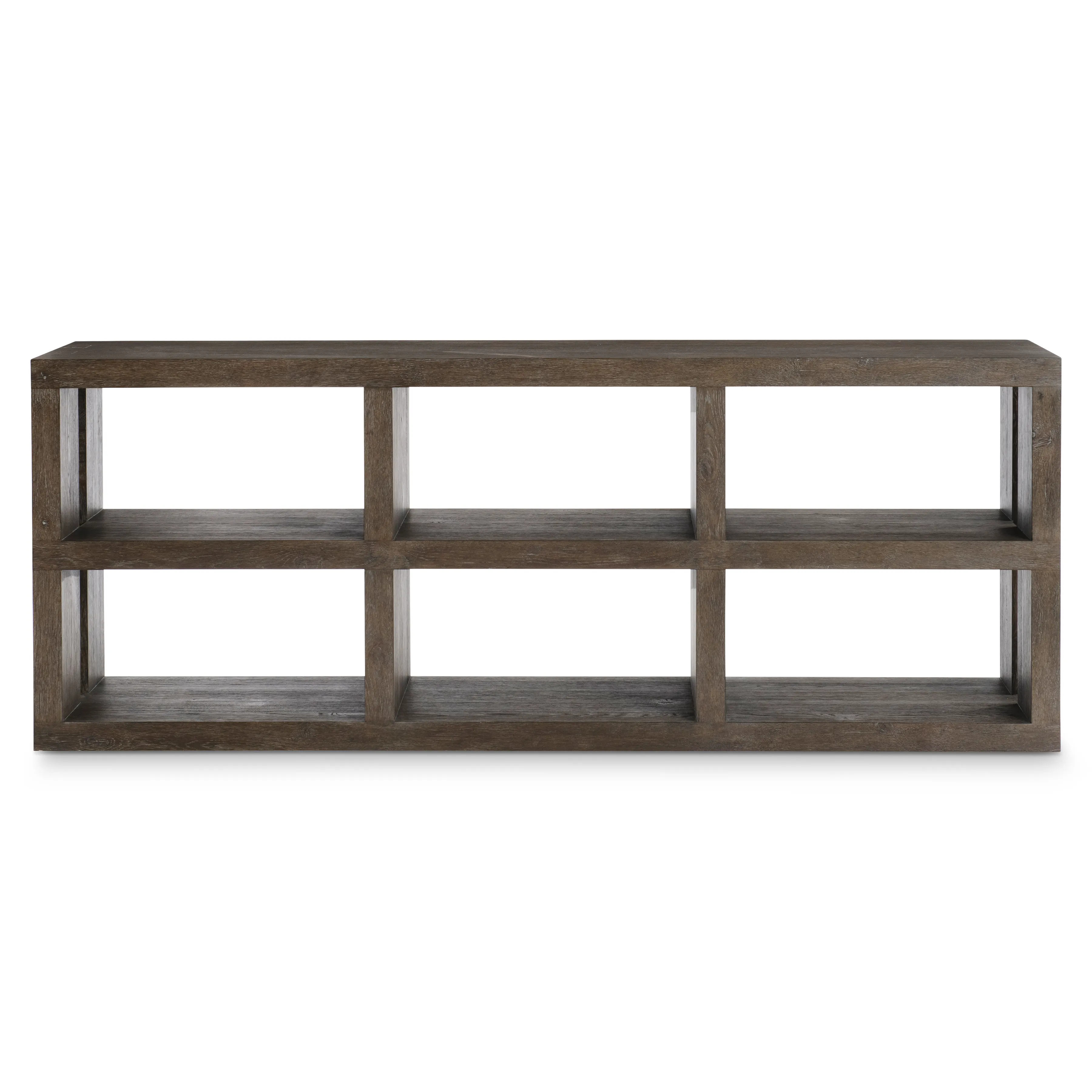 Wirebrushed Oak Console Table in Cassel finish with two fixed shelves with partitions. Adjustable glides. Anti-tip kit.