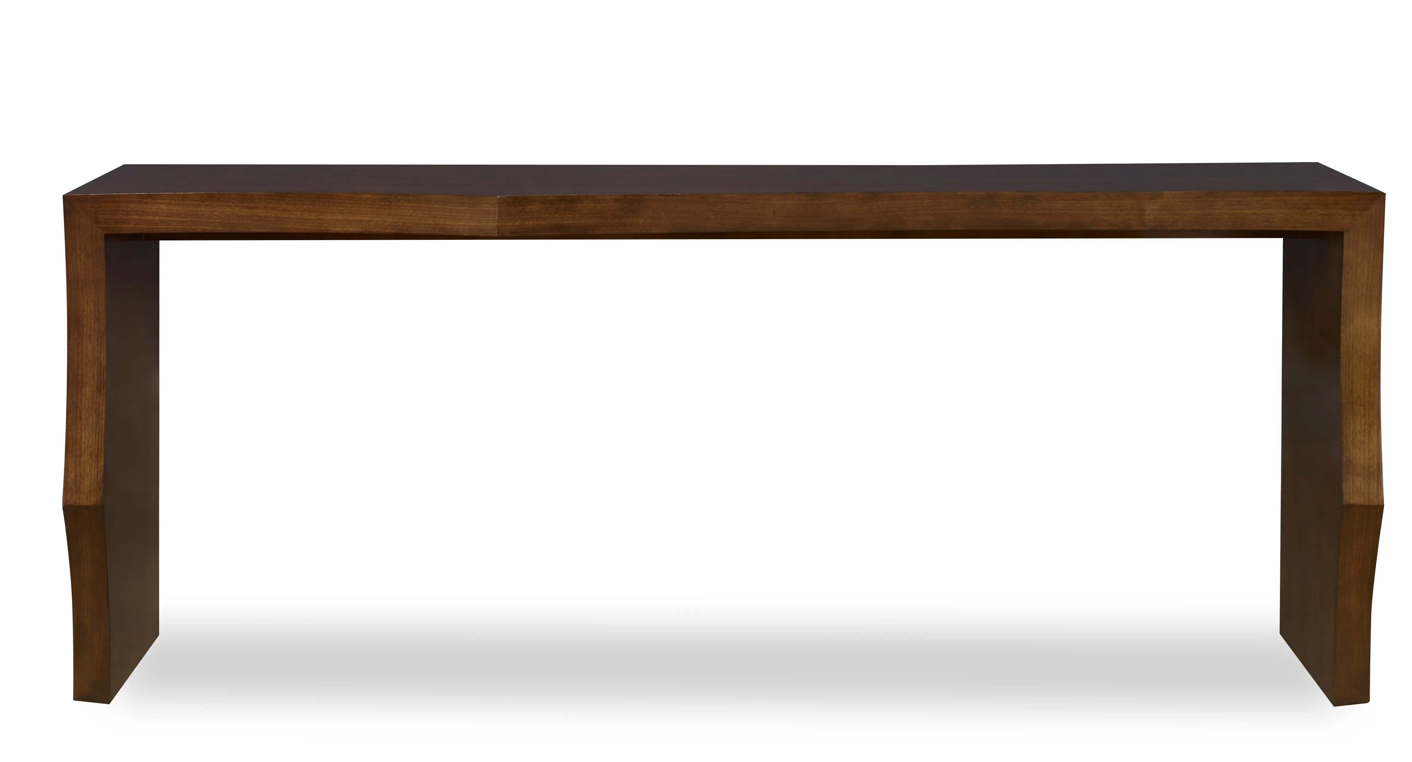 The Devin Console is designed to mimic the look of a live edge form with the leading edge faceted in an organic pattern. Wrapped in American Walnut Veneers that are stained in a honey brown finish, Devin showcases the beauty of wood grain in a consistent shape and form. The back edge is flat allowing this console to sit flush with a wall.