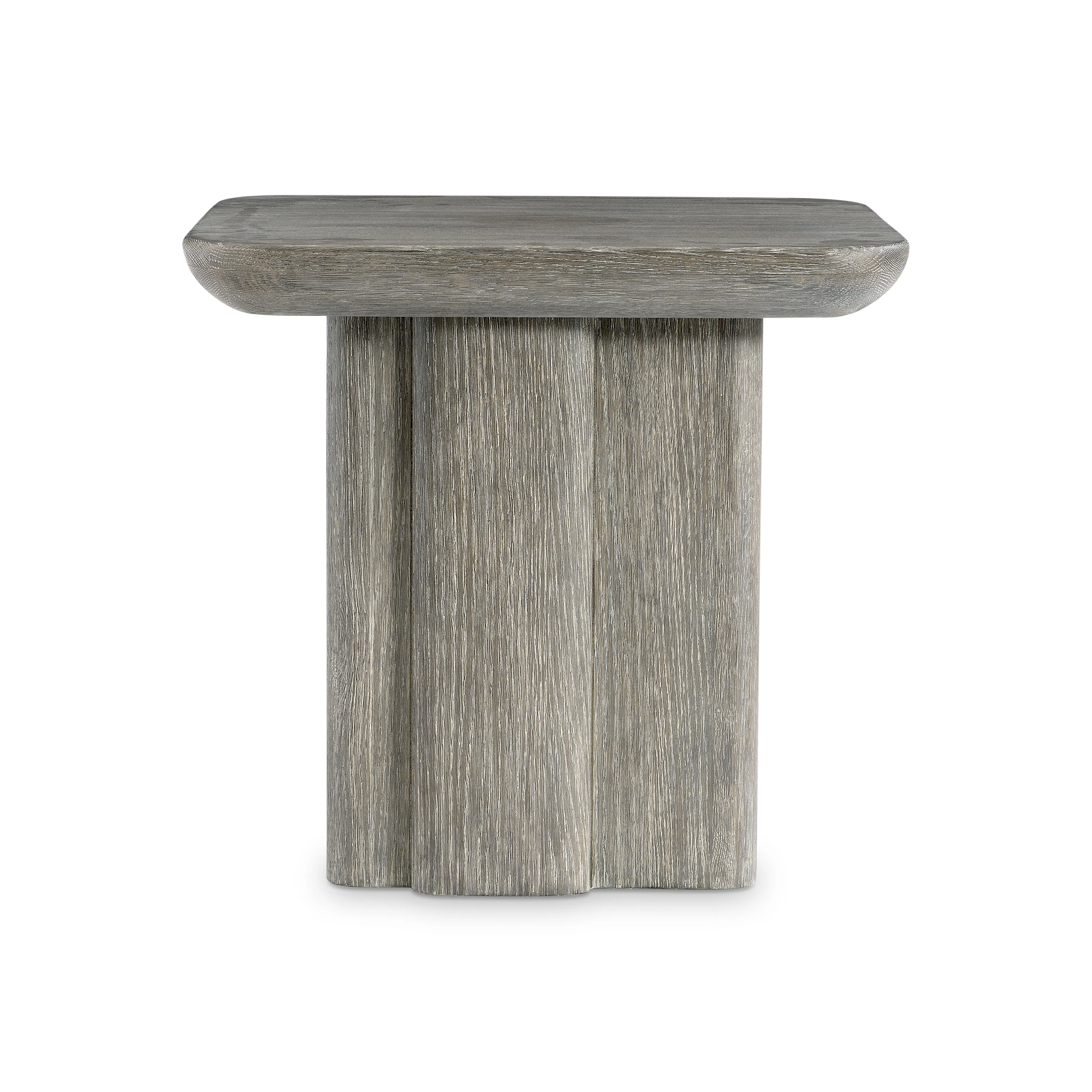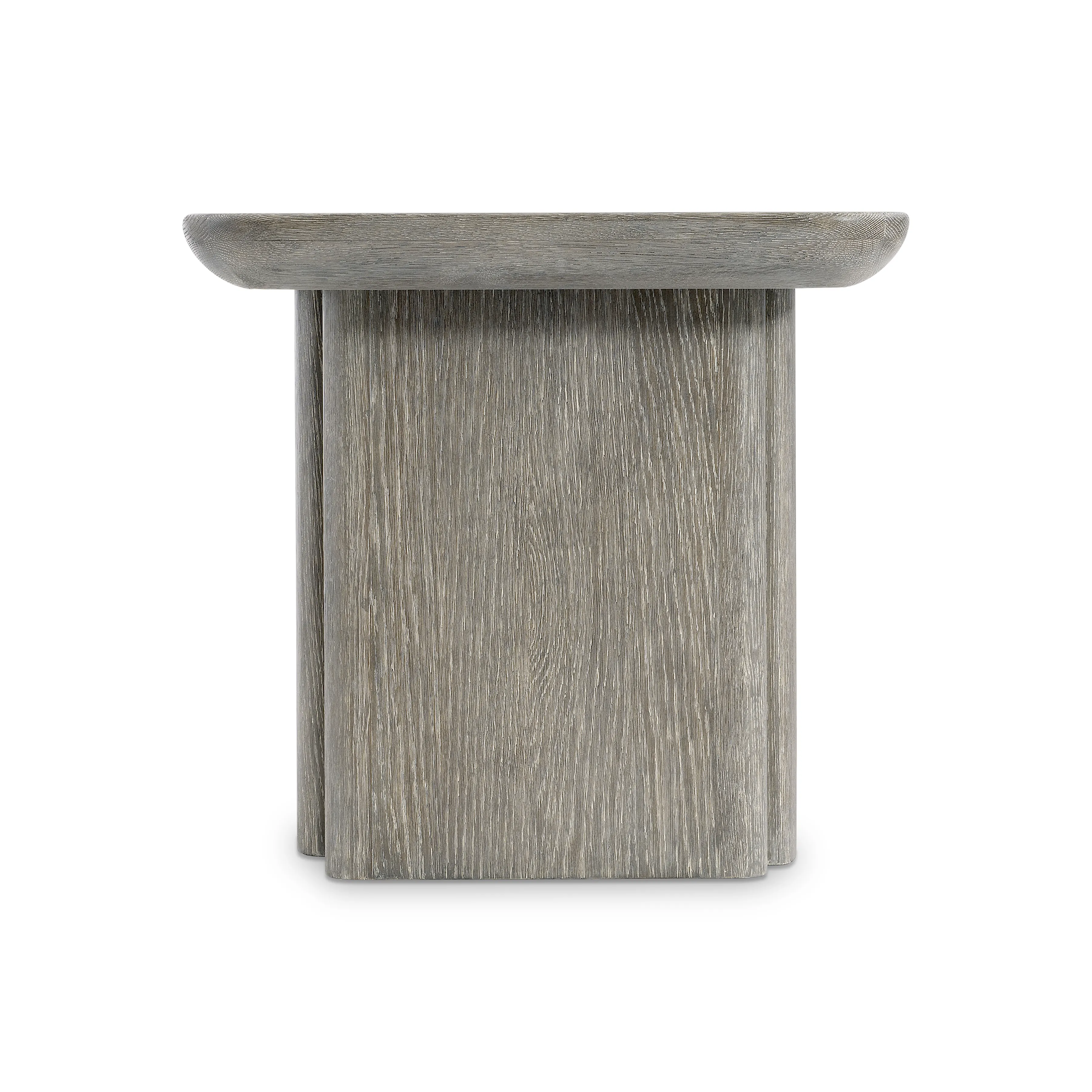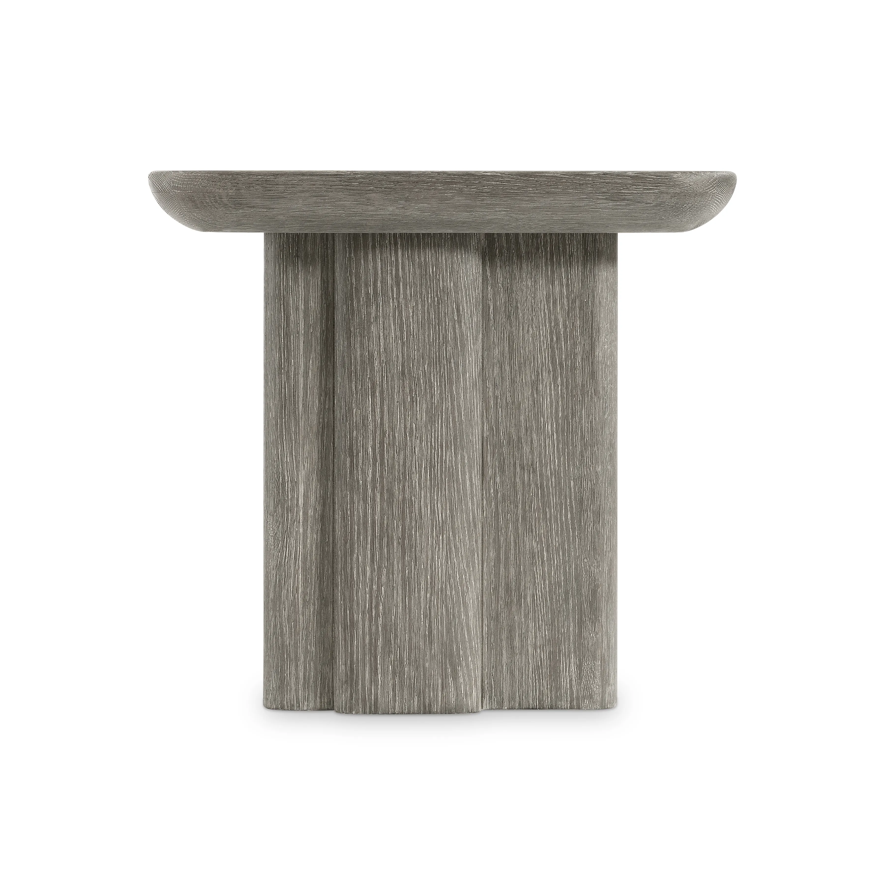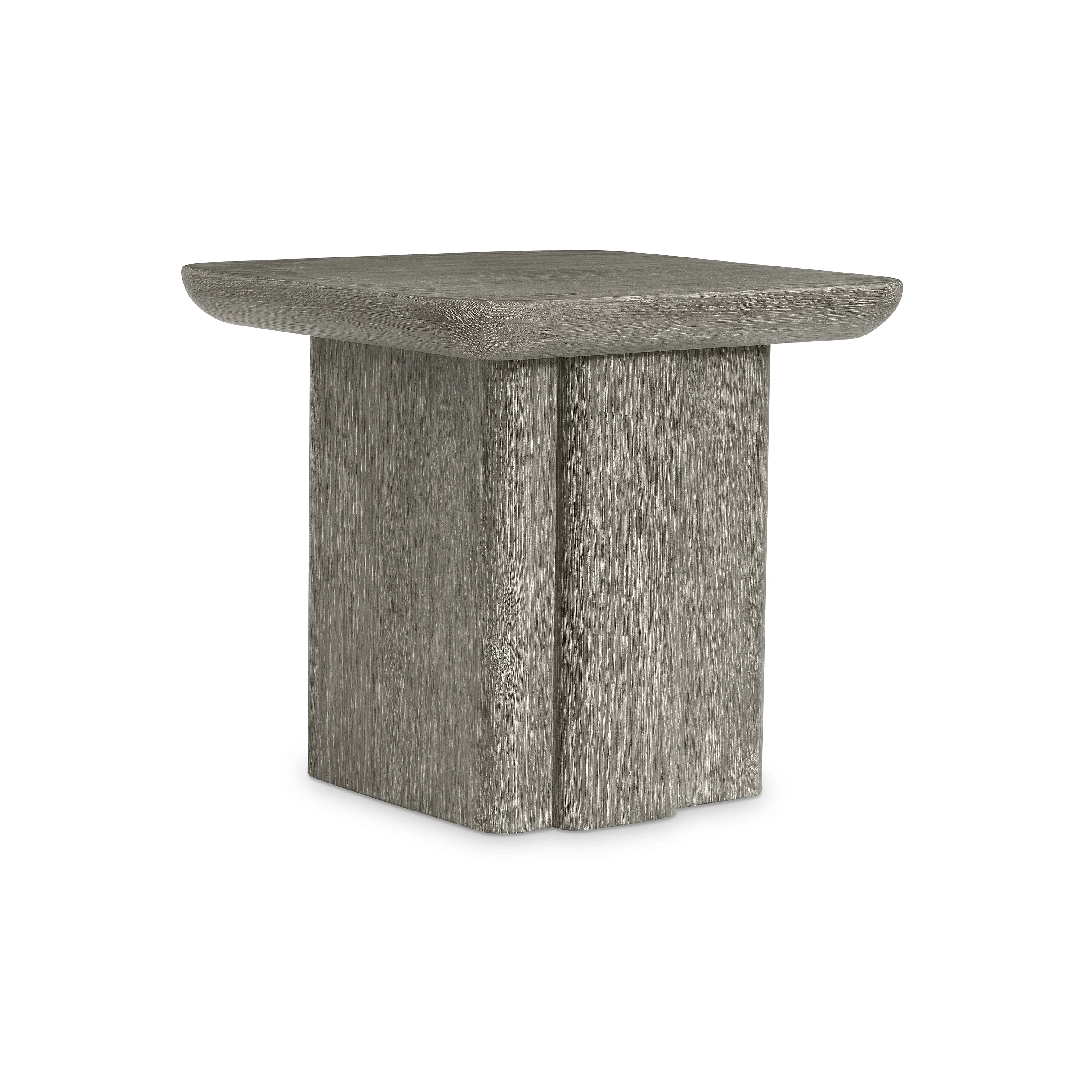 The Monolith side table perfectly balances curves and lines with a softly rounded square top and straight forms on the base. A unique panel extends from the base, offering a bold detail. Deep wirebrushing creates beautiful texture in Puma finish.
