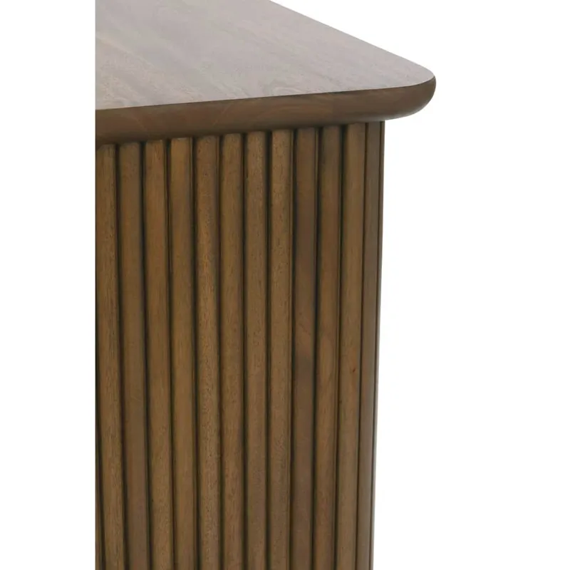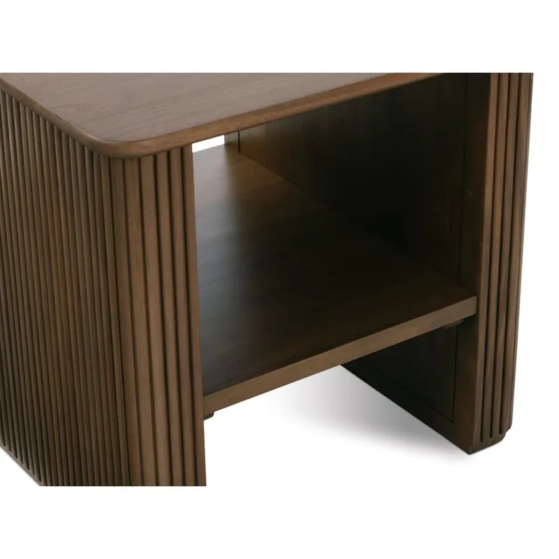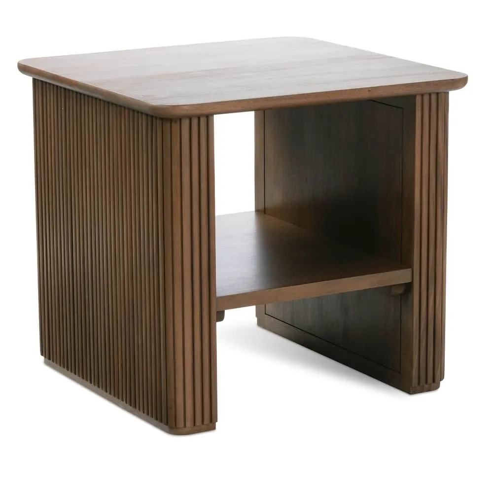 The Kindred Square End Table embodies timeless sophistication through its masterfully executed reeded design, where precise vertical lines create a mesmerizing rhythm that draws the eye while grounding the piece with architectural gravitas. Available in rich Godiva or organic Sesame finishes on premium solid mahogany, this thoughtfully crafted end table features gracefully rounded corners and a convenient open shelf that marries form with function. The table's clean silhouette and dimensional texture make it equally striking as a standalone statement or paired alongside a sofa, while its versatile proportions allow it to serve as both a refined end table or a sophisticated nightstand. Whether styled with a curated collection of books and objects or topped with an artisanal lamp, this piece brings an elevated yet approachable presence to any space, seamlessly bridging classic design elements with contemporary sensibility.