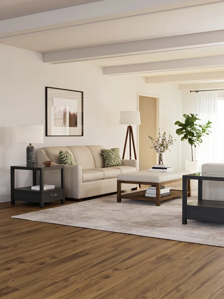 This addition to the Dwyer occasional group trades a floating wood tabletop for a smooth panel of inset glass, while retaining the collection's clean modern styling. A low-positioned soft-close drawer creates an airy shelf space above, and, as with all Origins by Stickley pieces, you can customize the table with your choice of finish and hardware.