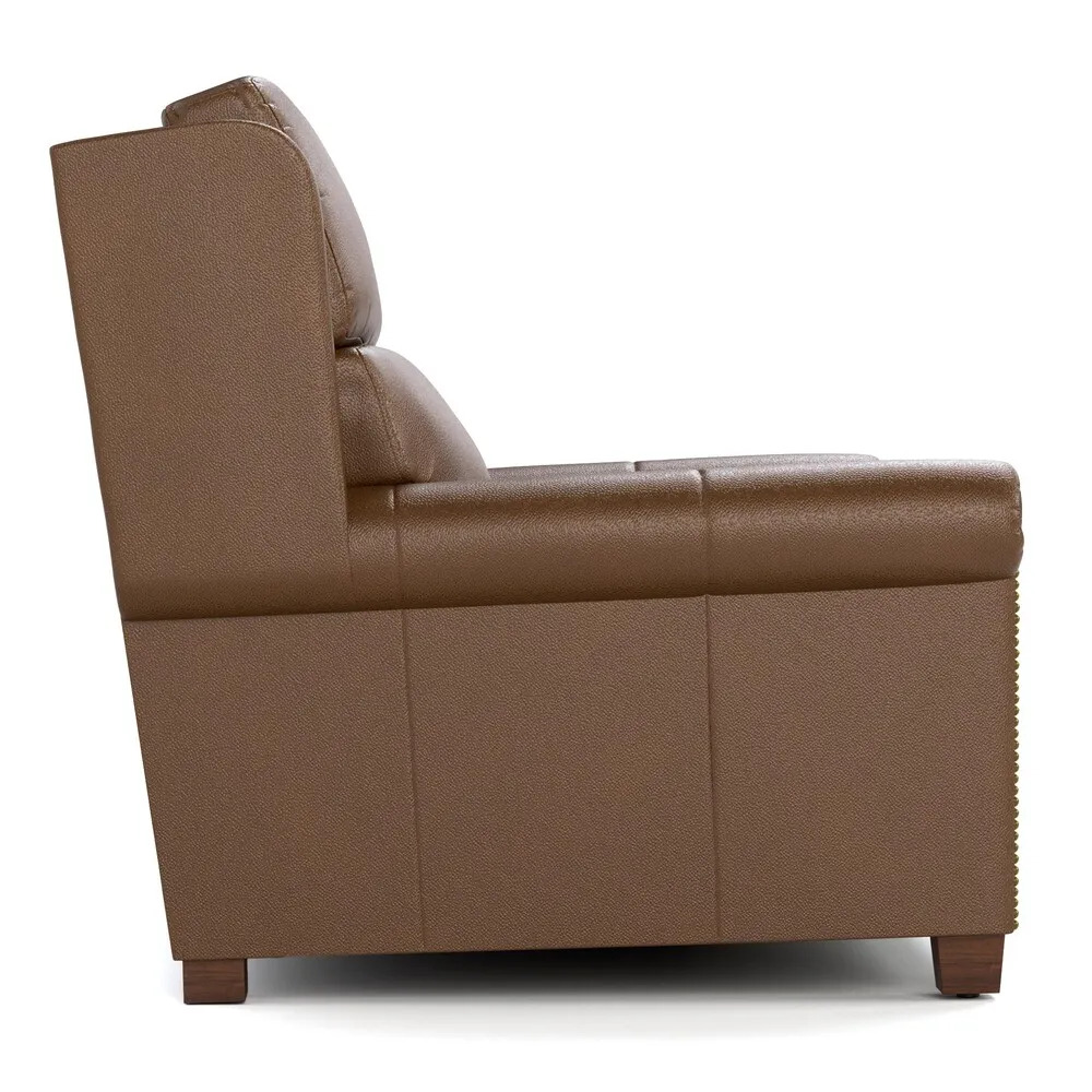 Our Woodlands upholstery creates handsome centerpieces that anchor a room, with tall, upright profiles offset by smaller-scale arms. This Small Roll Arm Motion Loveseat with Nails seats two comfortably and features a traditional arm style with classic nailhead trim. On the inside of the arm, you'll find switches that control state-of-the-art wall-hugging power motion and an articulating headrest, as well as a USB charging port for your devices. Eight-way hand-knotted springs provide even support and comfort. Available for Express Ship in three Selvano leathers with your choice of any Maple finish and any ½-inch nail trim.