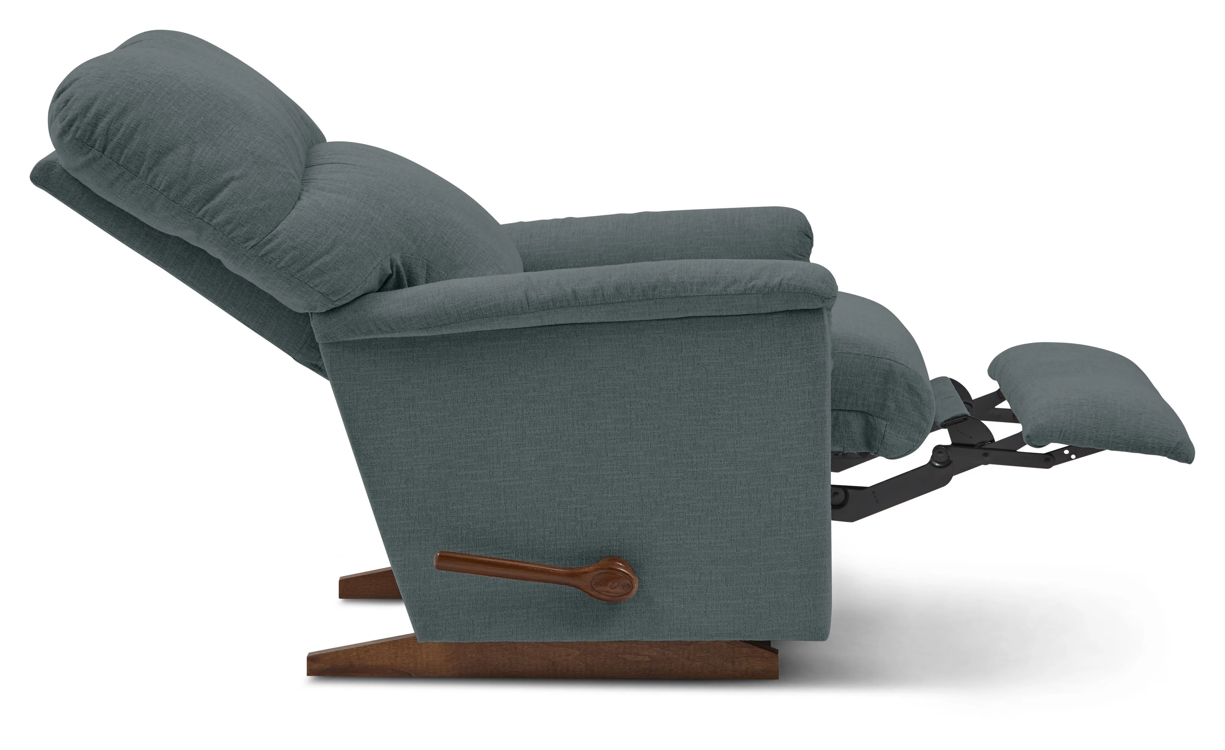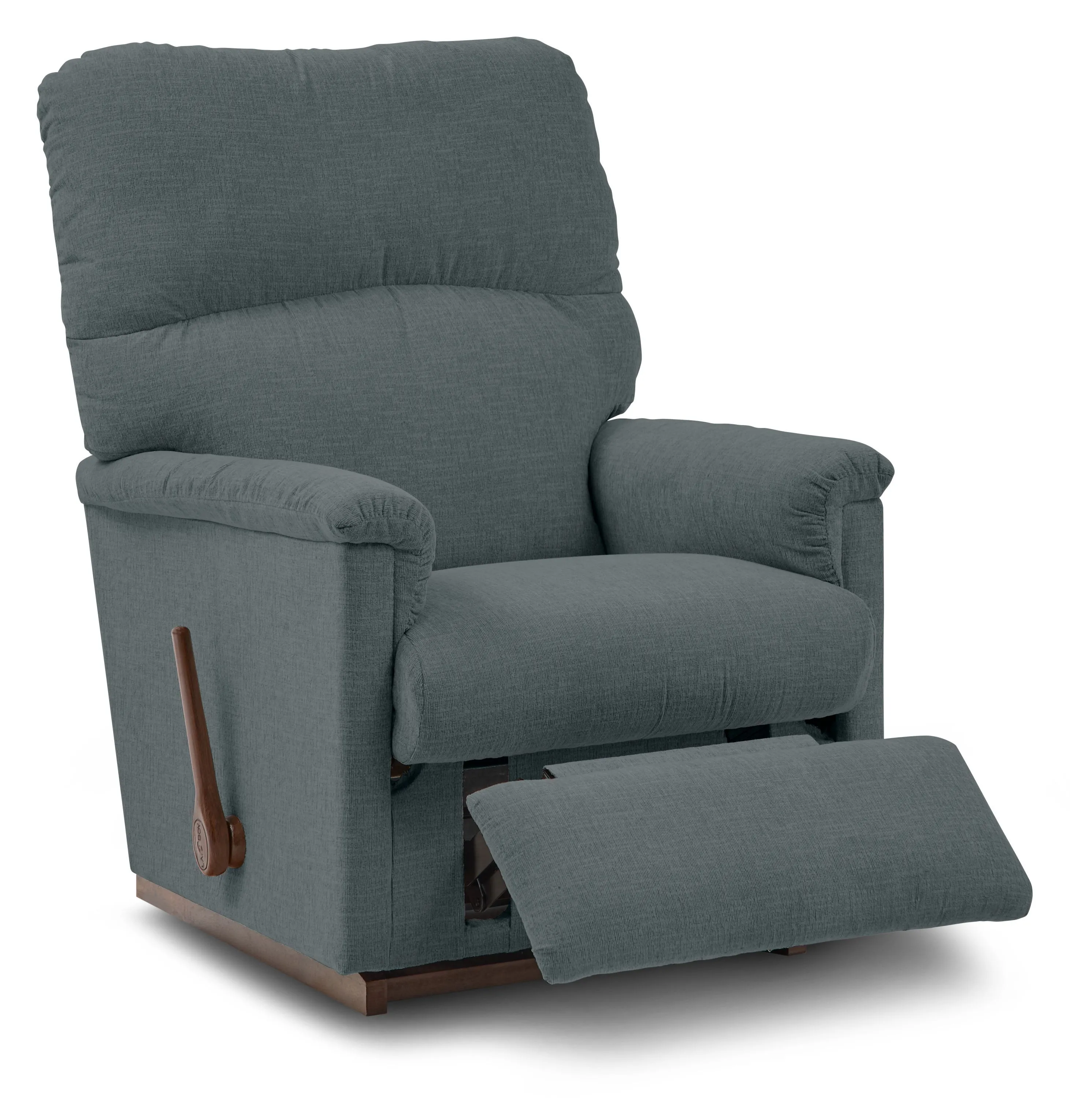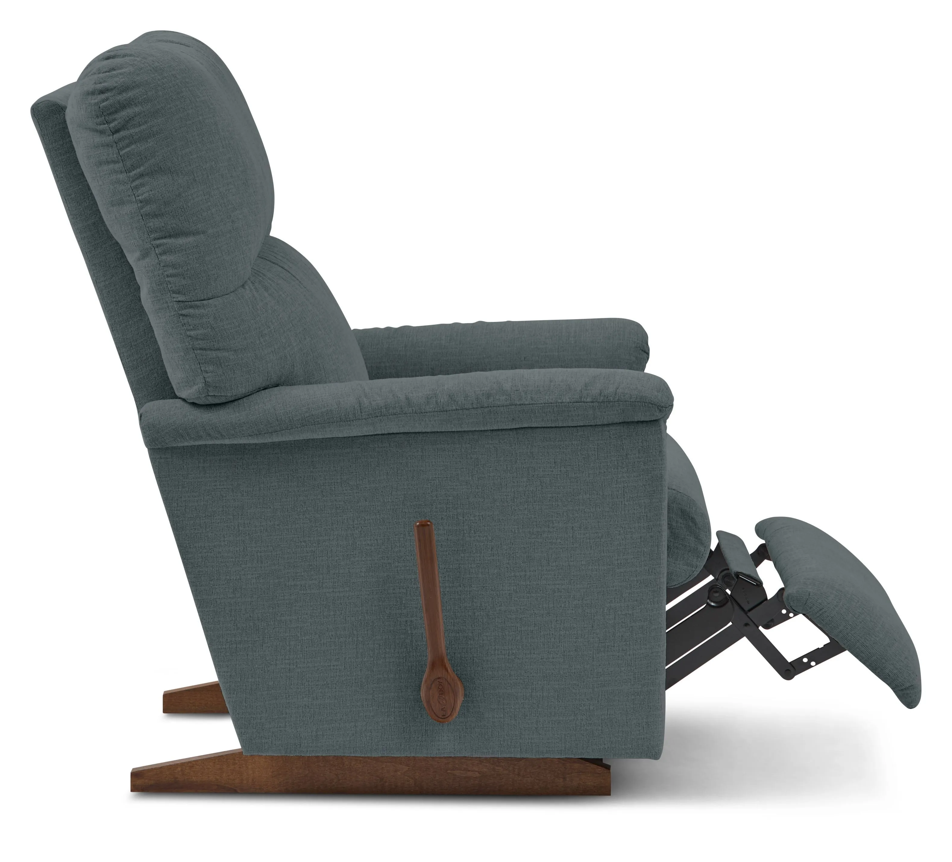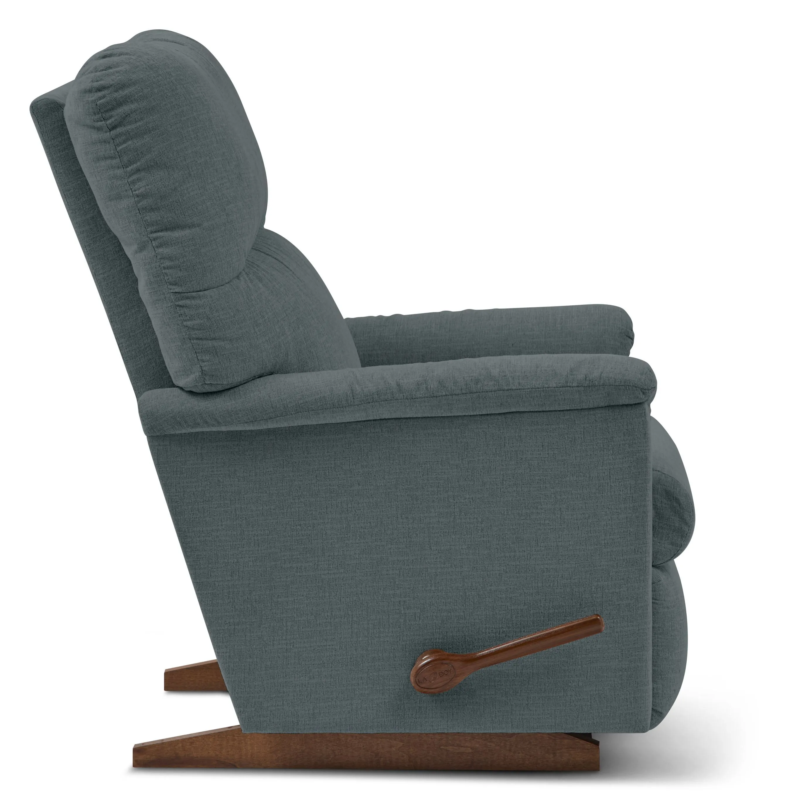 Our Collage Rocking Recliner is a family favorite that's easy to love. Its petite scale and updated style allow it to blend into just about any room. Collage features a bullnose (rounded edge) seat, padded flared arms and a decorative pull in the back cushion. Simply use the convenient handle on the outside arm to raise the legrest for reading, relaxing or watching TV. When you're not reclining, it's a relaxing rocker with a smooth, graceful motion. Make it yours with your choice of fabrics and other available upgrades.