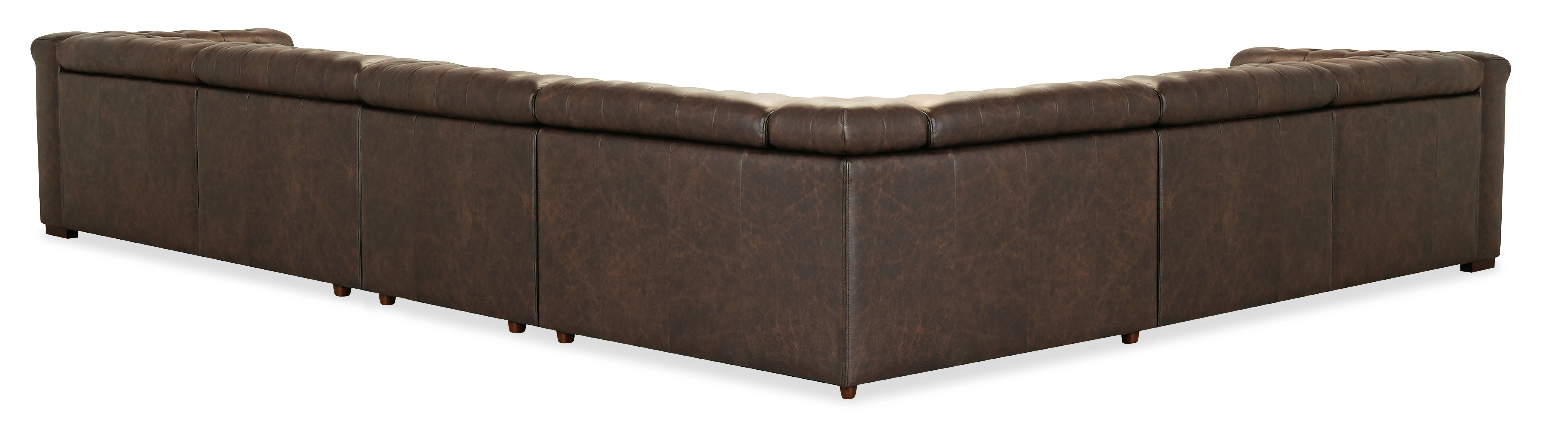 This Savion Deux 6 Seat Sectional, upholstered in rich West Saddlewood leather, offers four power recliners and seven power headrests. With classic chesterfield tufting, copper-toned nail trim, and dark wood accents, this sectional is the epitome of luxurious seating. The discreetly concealed power reclining function ensures comfort without sacrificing style, making it ideal for larger, sophisticated living spaces.