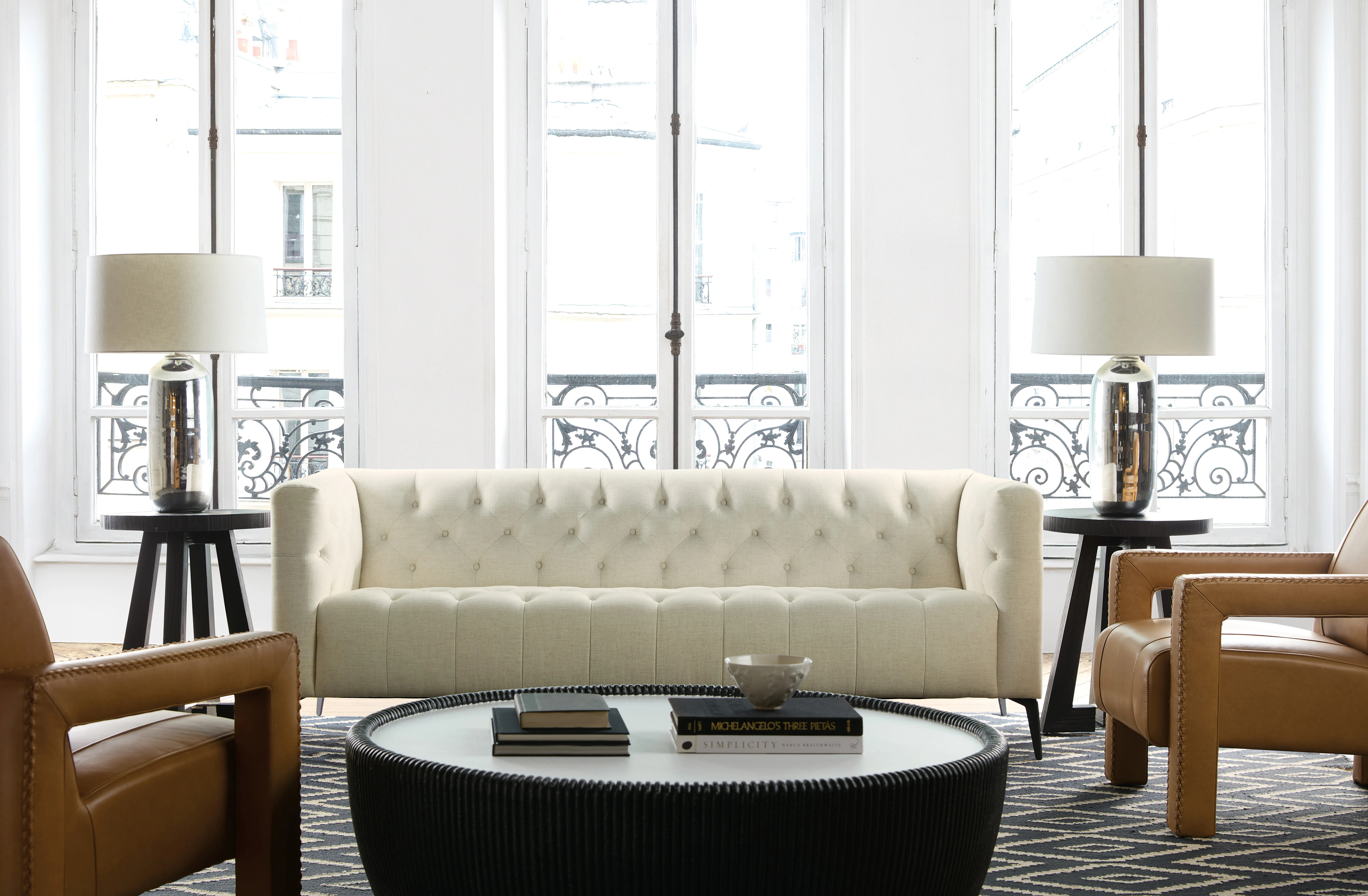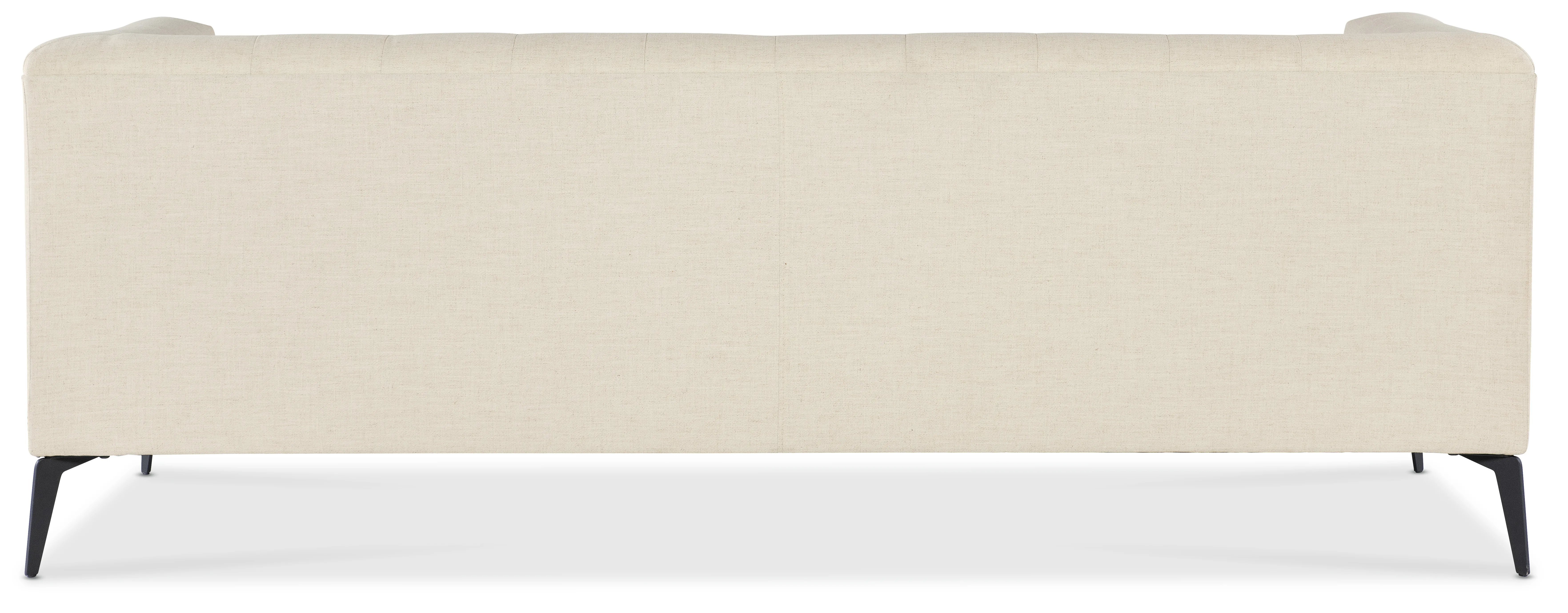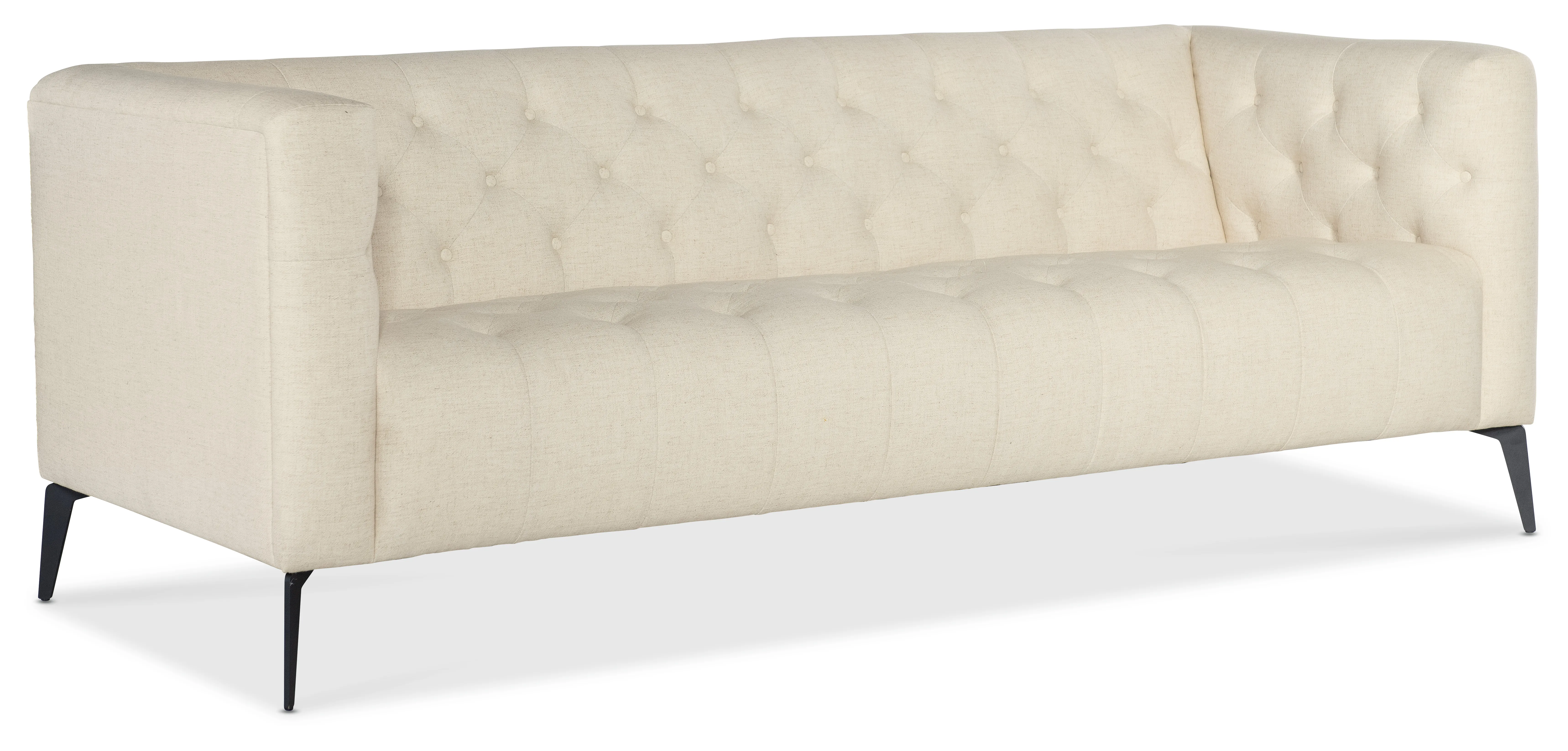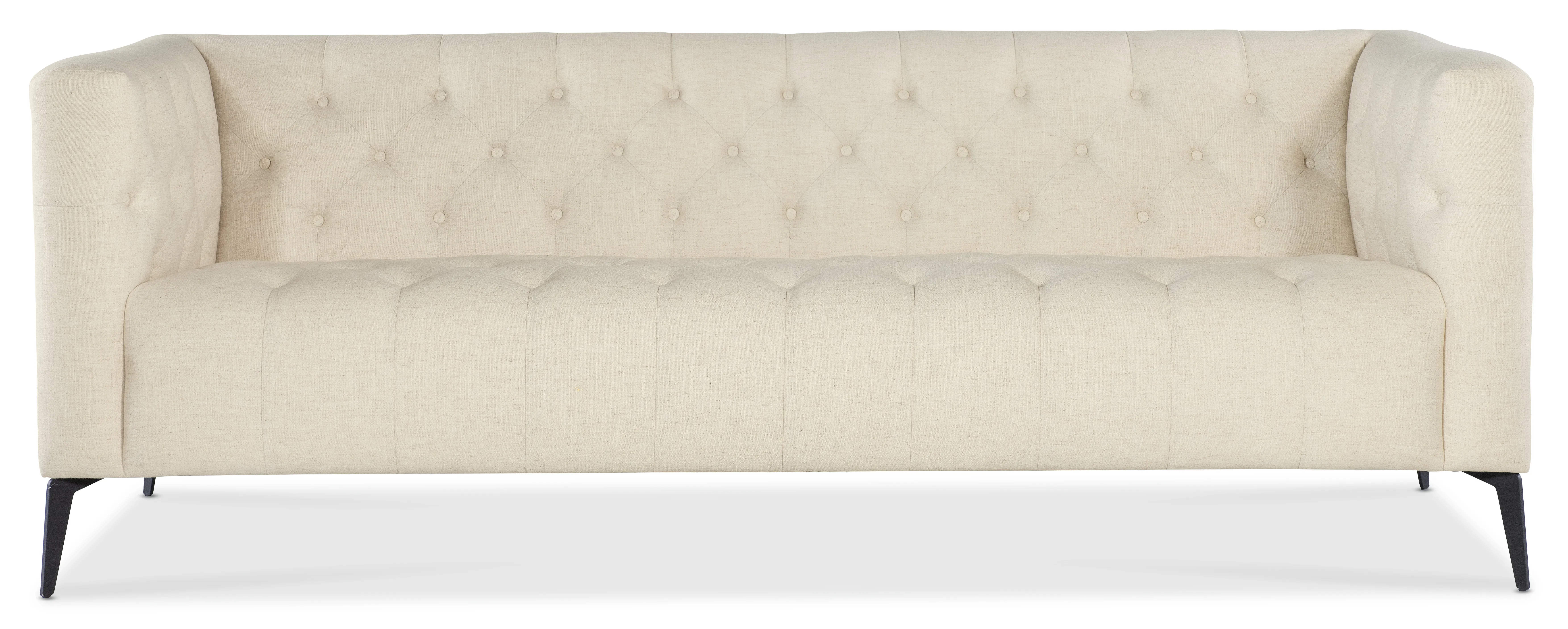 The Nicolla Stationary Sofa in Baldwin Natural performance fabric exudes modern traditional charm. Its chesterfield-inspired shelter arm design, combined with button tufted detailing, offers a blend of elegance and comfort. The heathered two-tone sand-colored flat weave fabric adds sophistication, while tall matte black metal tapered legs enhance its modern, airy appeal. Perfect for any living room, this sofa combines style and comfort seamlessly.