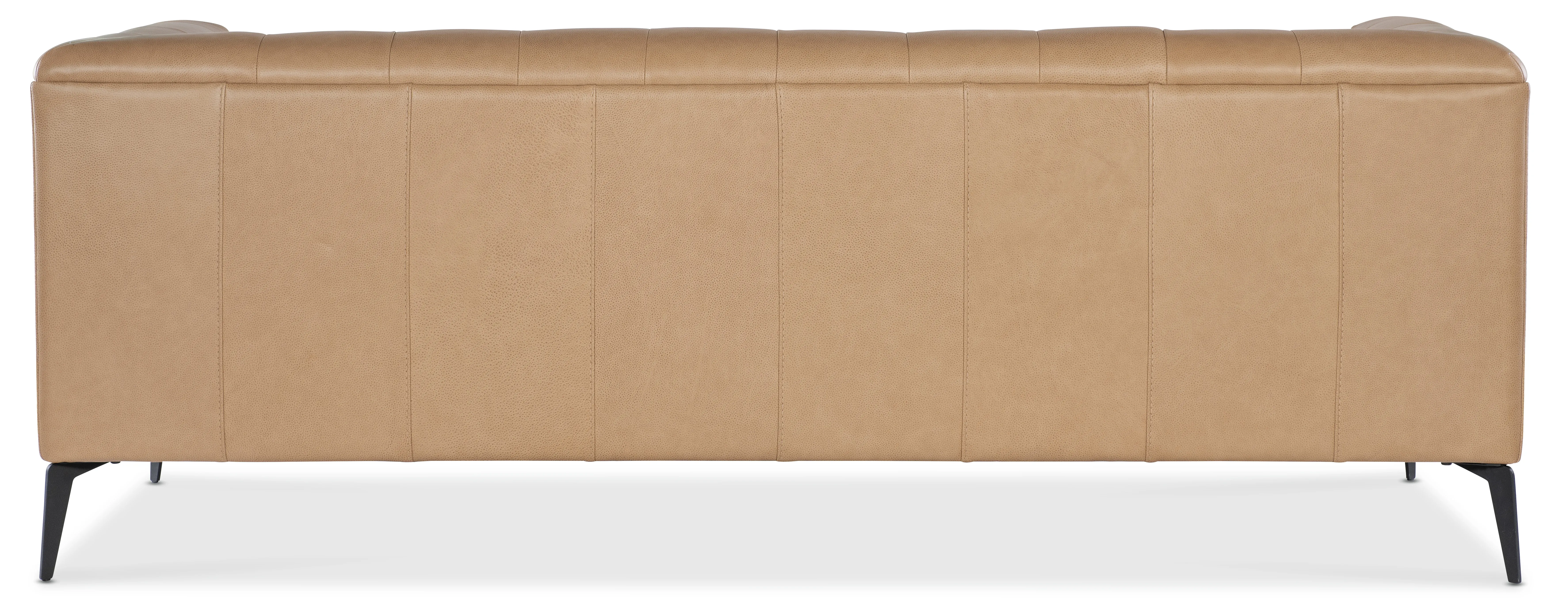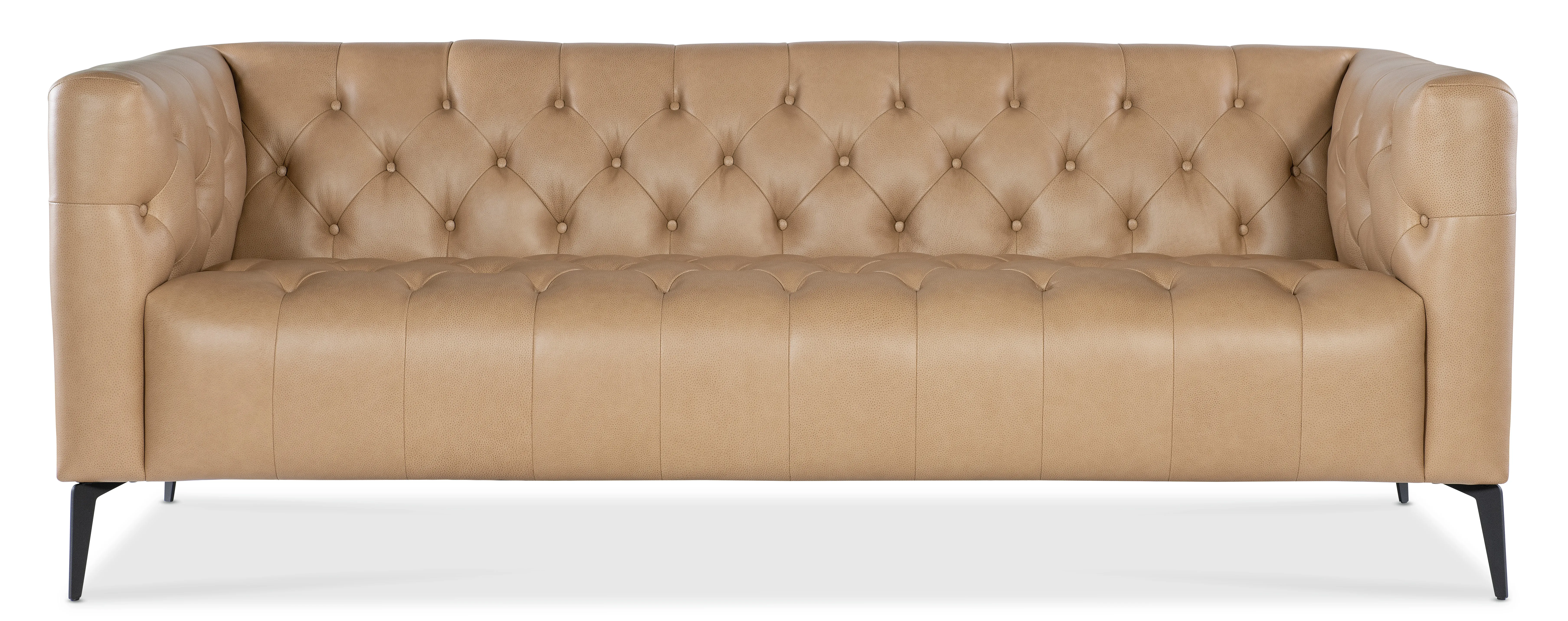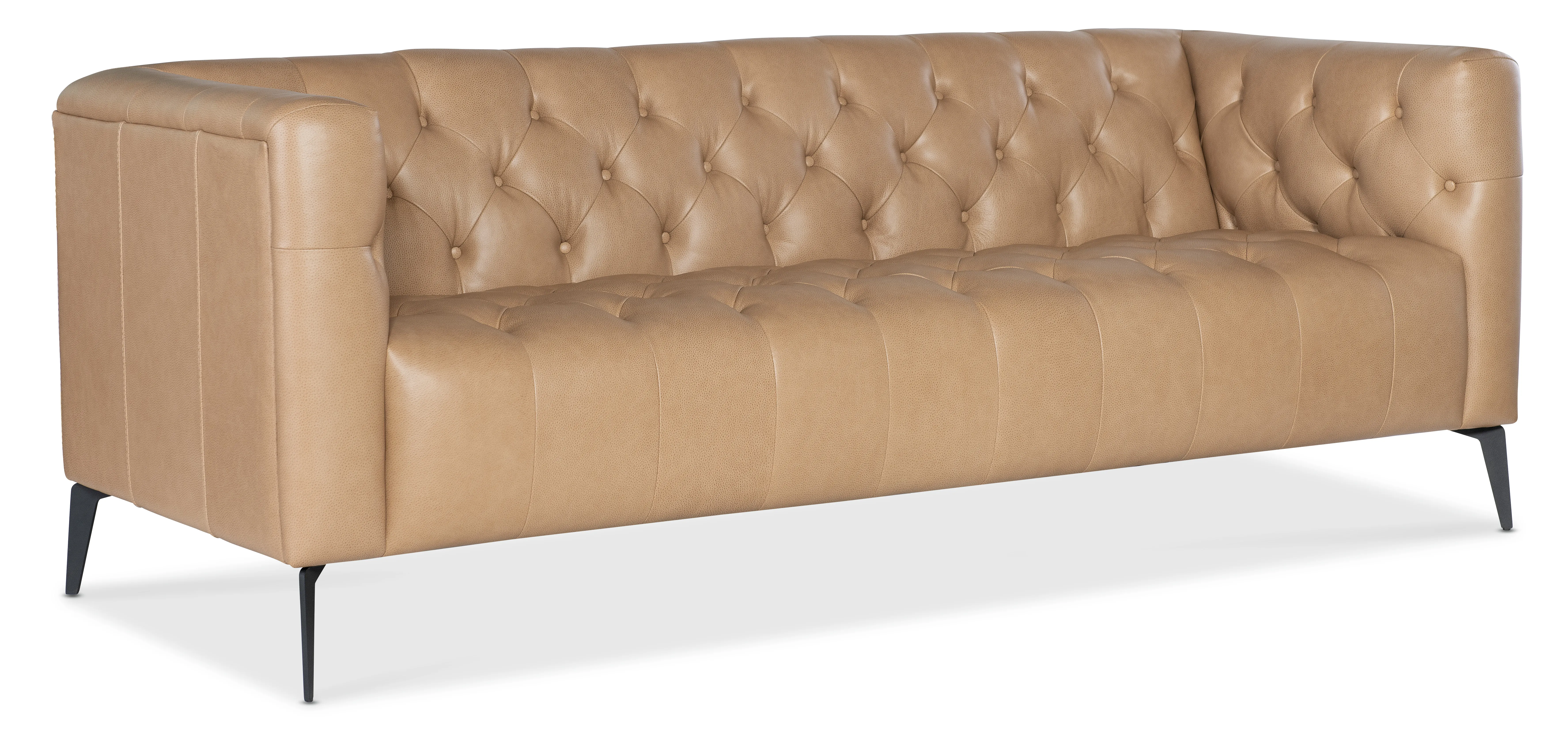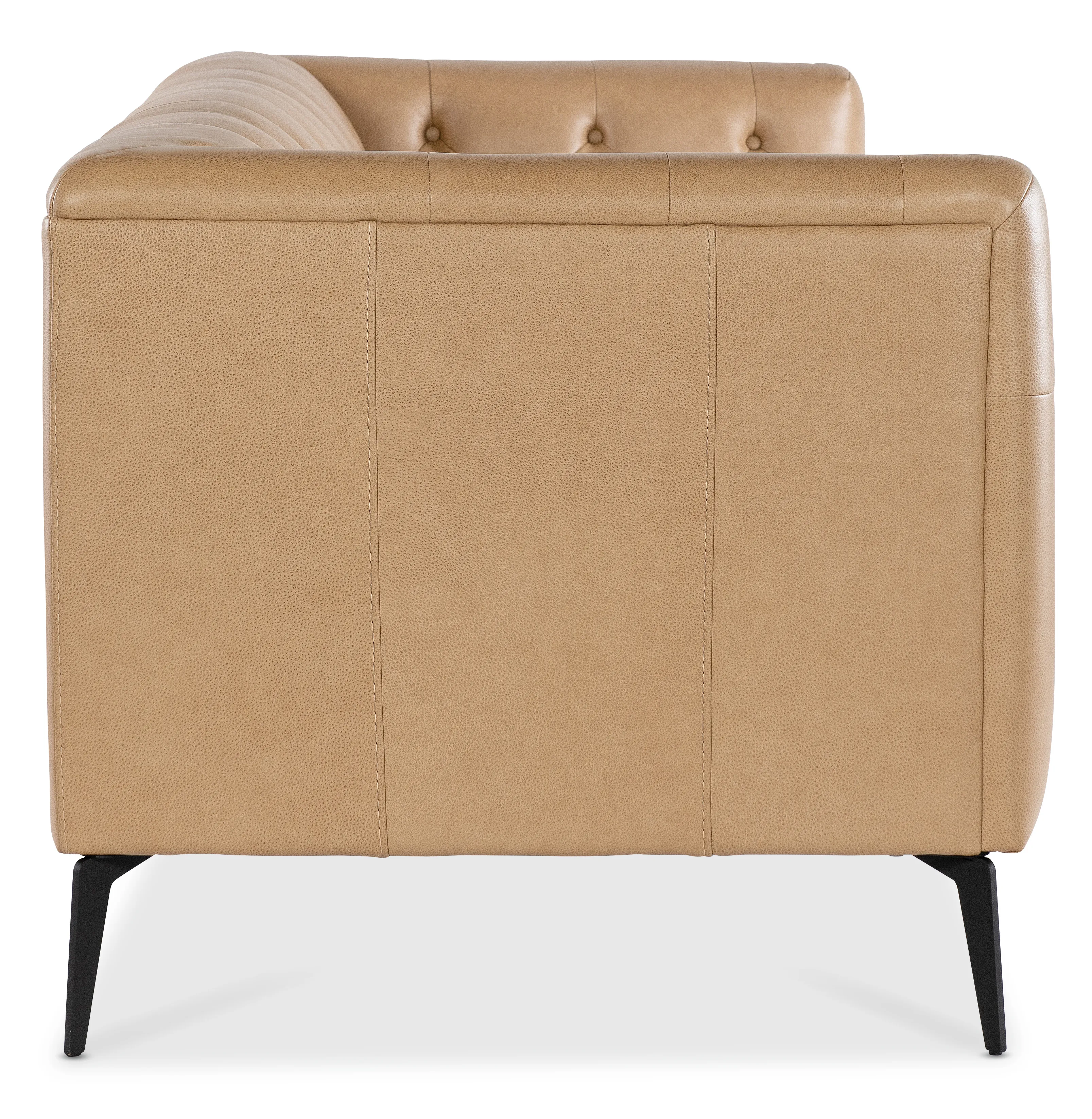 The Nicolla Stationary Sofa, upholstered in Texas Stone Semi-Aniline Top Grain leather, brings together traditional elegance and modern design. With its button tufted interior and chesterfield-inspired shelter arm design, the sofa rests on tall matte black metal tapered legs, giving it a light and airy aesthetic. This sofa is the perfect addition to any stylish living room.