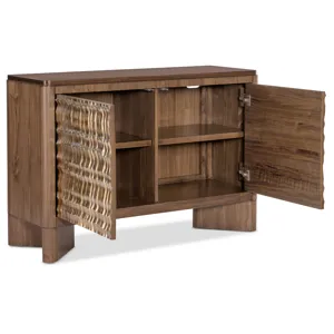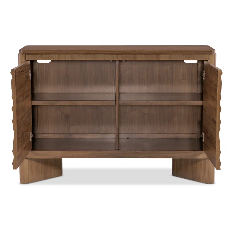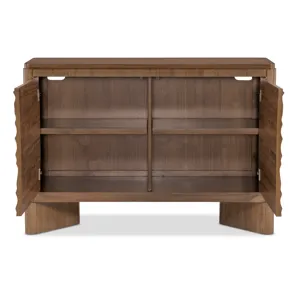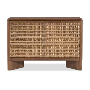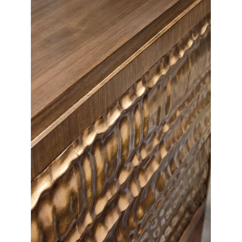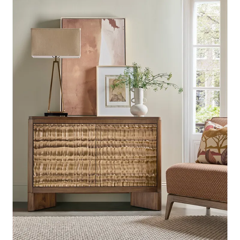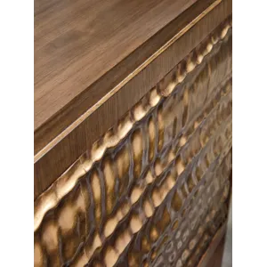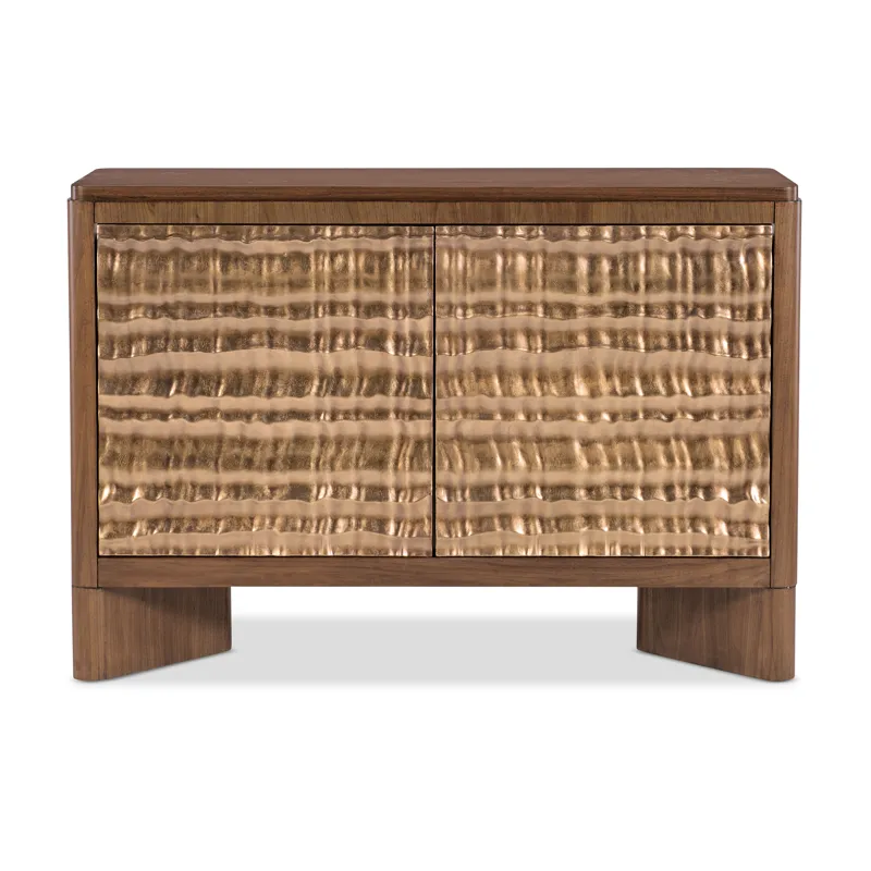 Add modern artistry to your living space with the Eleana Two Door Chest, featuring a Light Caramel walnut veneer finish and sculptural Sunlit Bronze door fronts. Inside, two compartments with fixed shelving offer discreet storage. Its organic gold-toned doors and soft-close hinges make this chest a striking statement piece for transitional interiors.