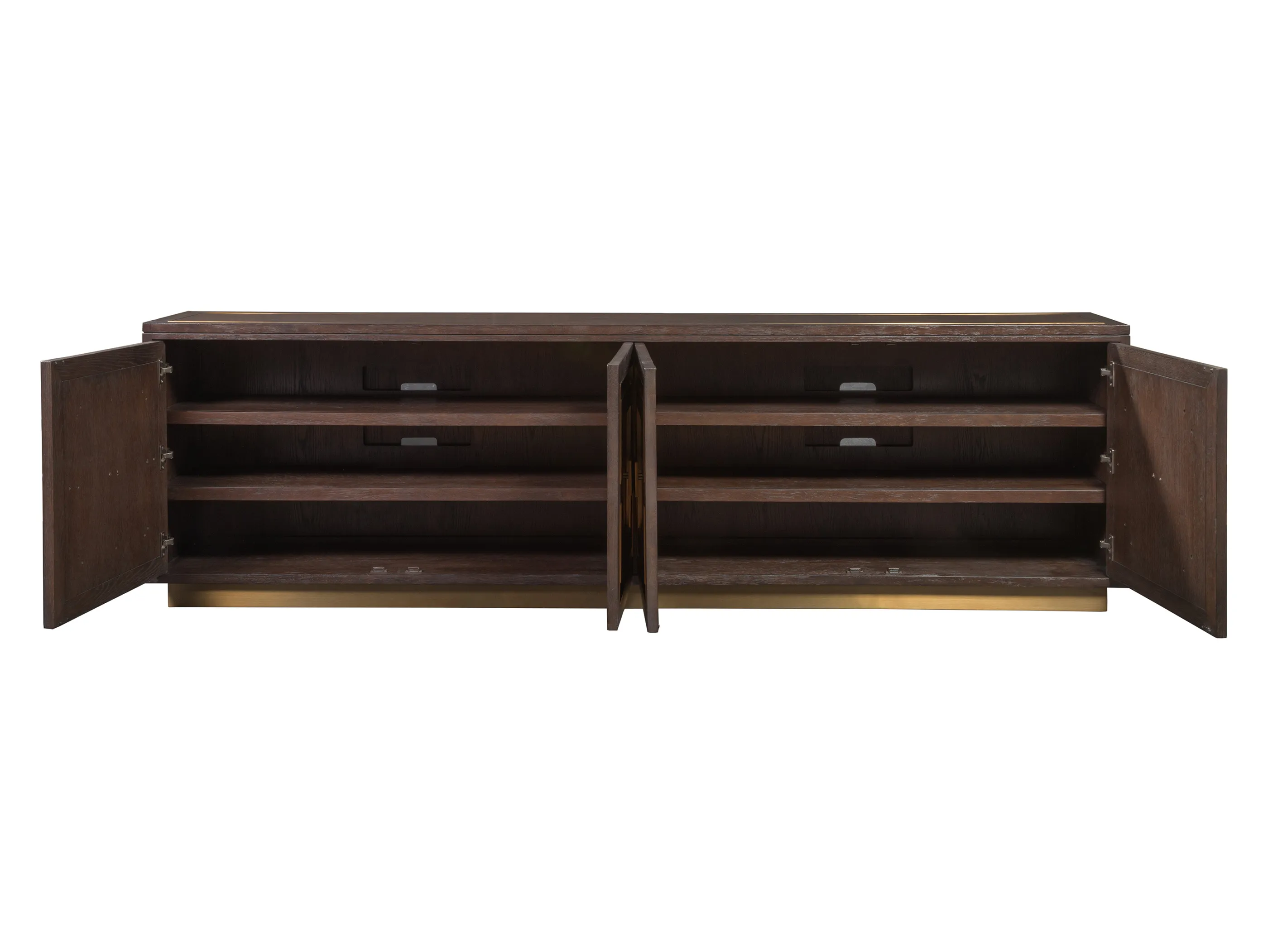 Vintage modern designs in both flat and quartered cut white oak veneers and select hardwoods in a rich brown wirebrushed and cerused finish. Custom hardware, accents, and plinth base in an antiqued brass finish. Four doors and four adjustable shelves, two behind both pairs, with ventilated back.