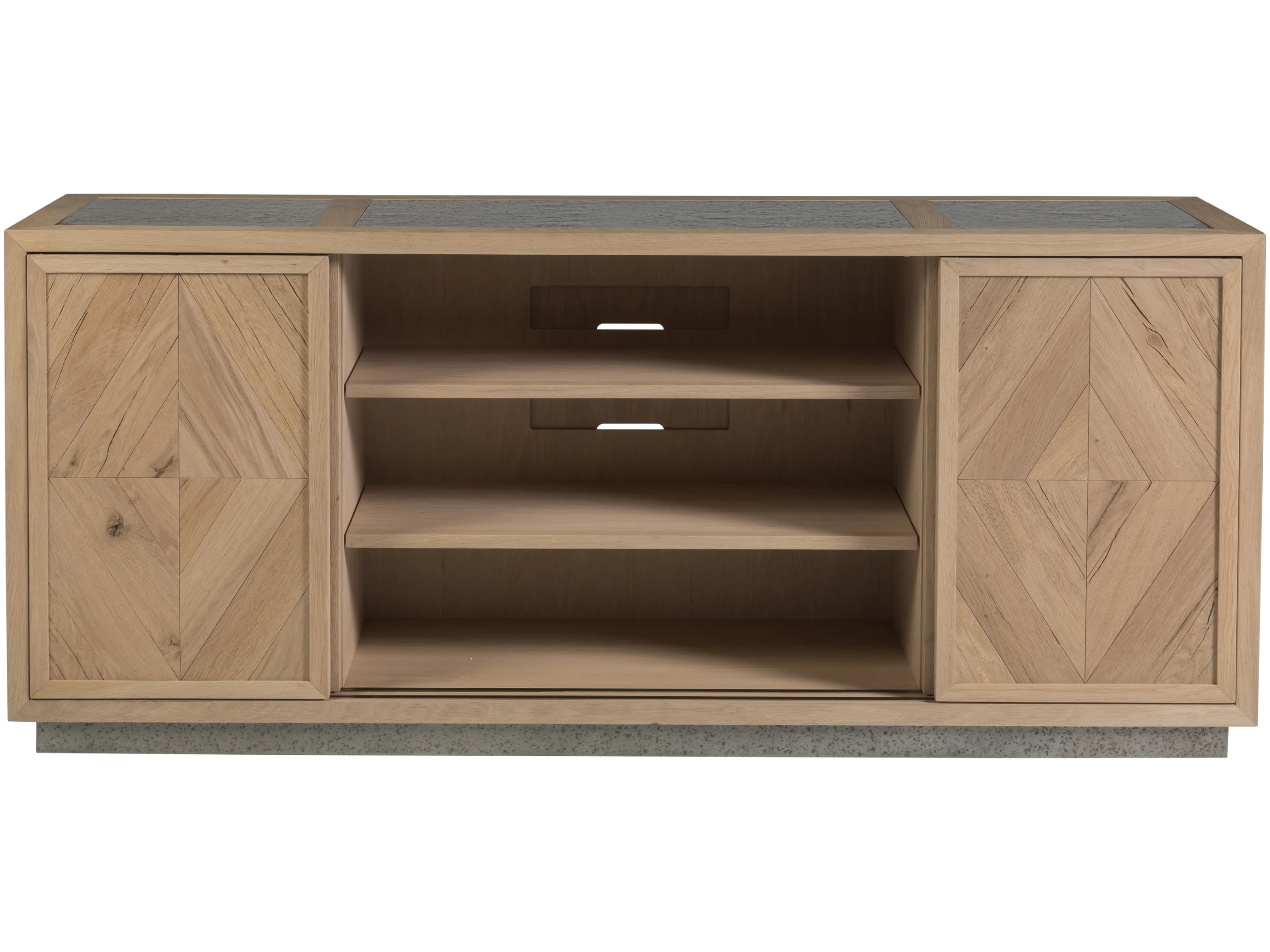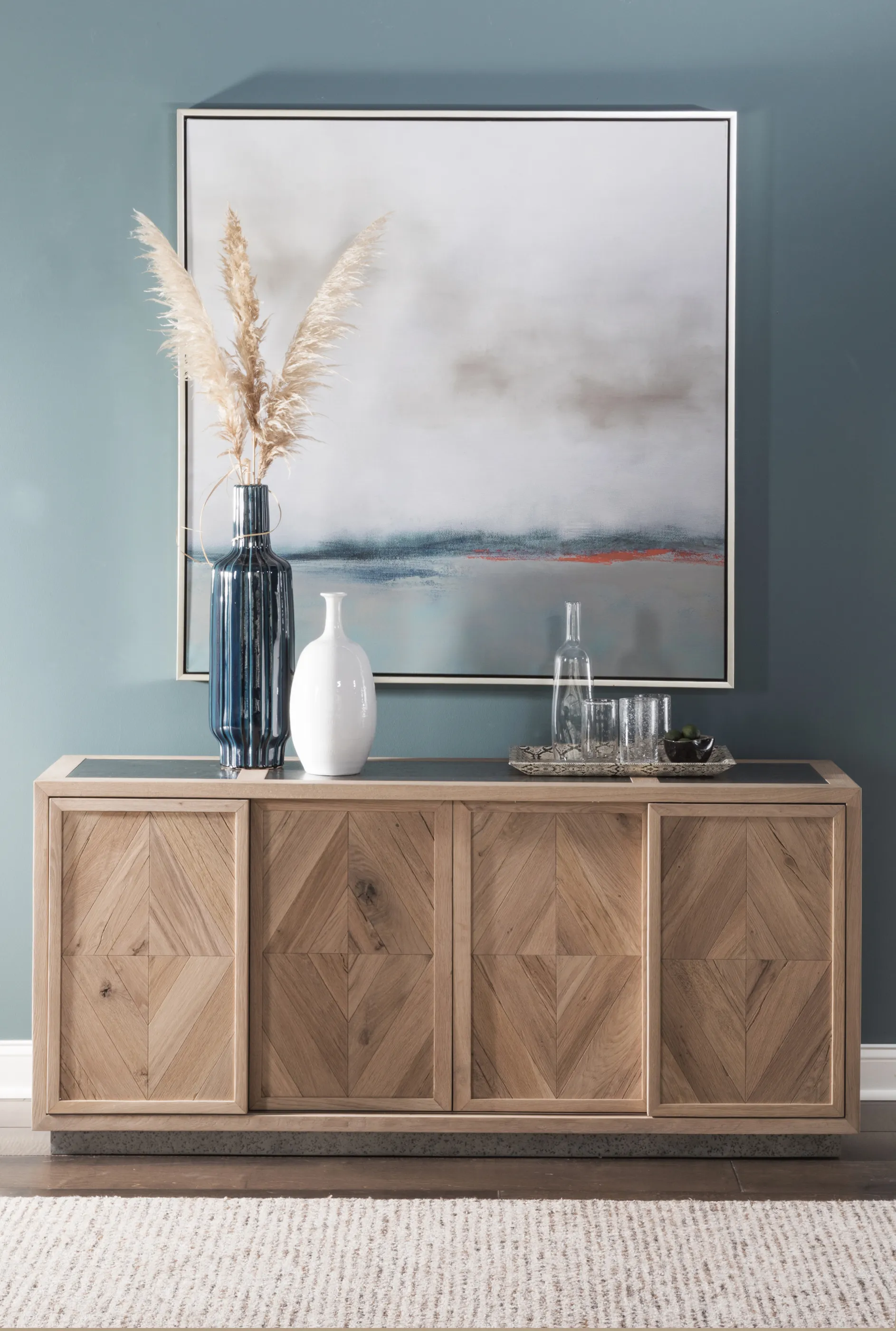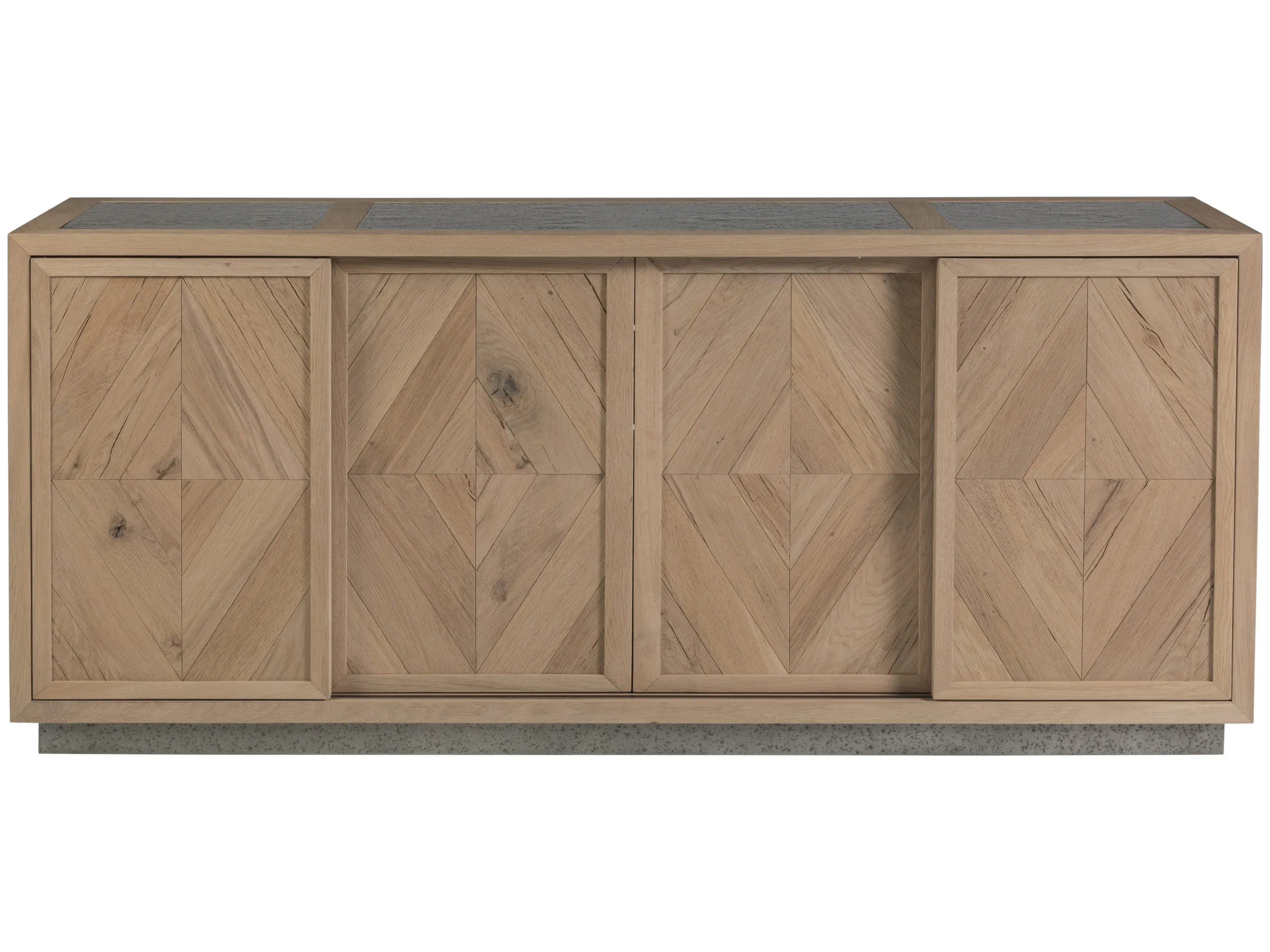Orienting the White Oak planks in a diamond pattern further enhances the natural variations in the wood, and the pitted aluminum top inlays and plinth base provide just enough contrast. The 4 sliding doors reveal 4 adjustable shelves._x000D_