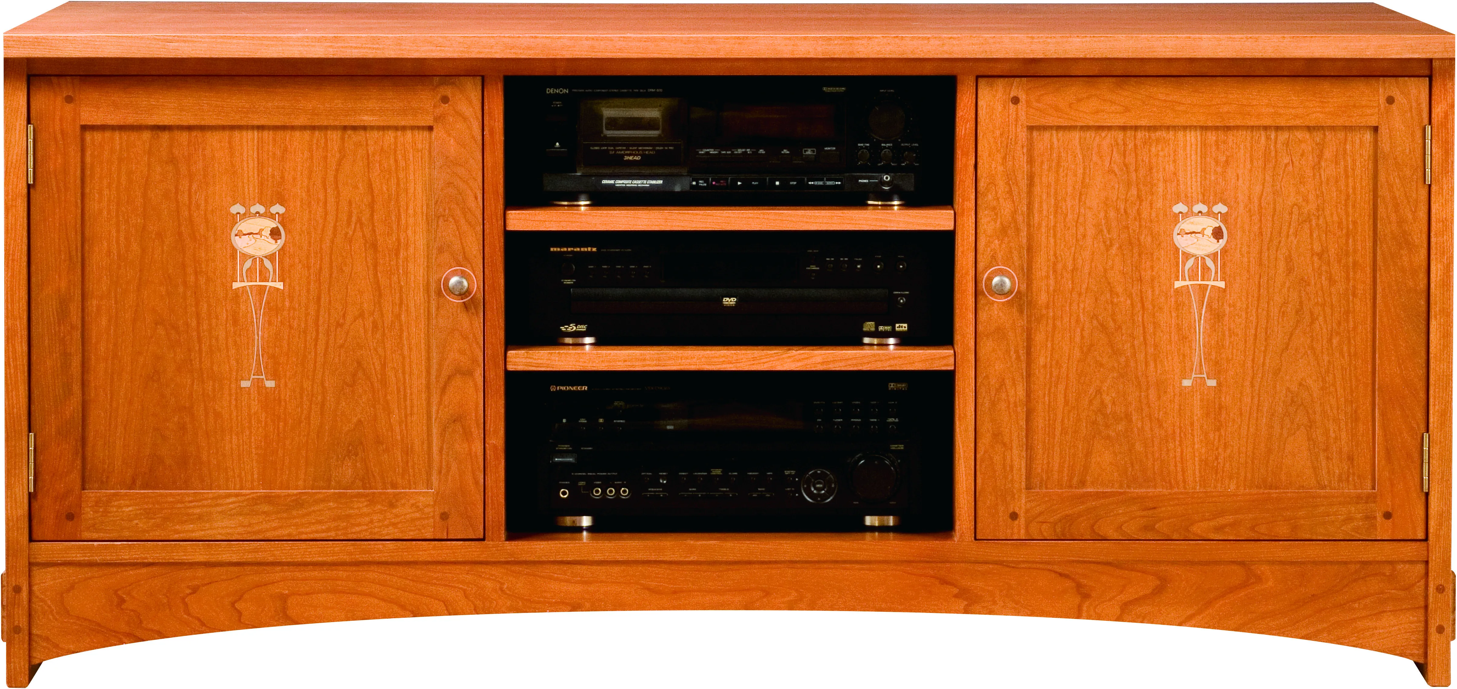 There is easy access to electronics on this console with an open center with two adjustable shelves. Two doors with Harvey Ellis inlay flank each side; the right door opens to reveal two adjustable shelves and a single adjustable shelf is on the left. Can be bunched with bookcase units.