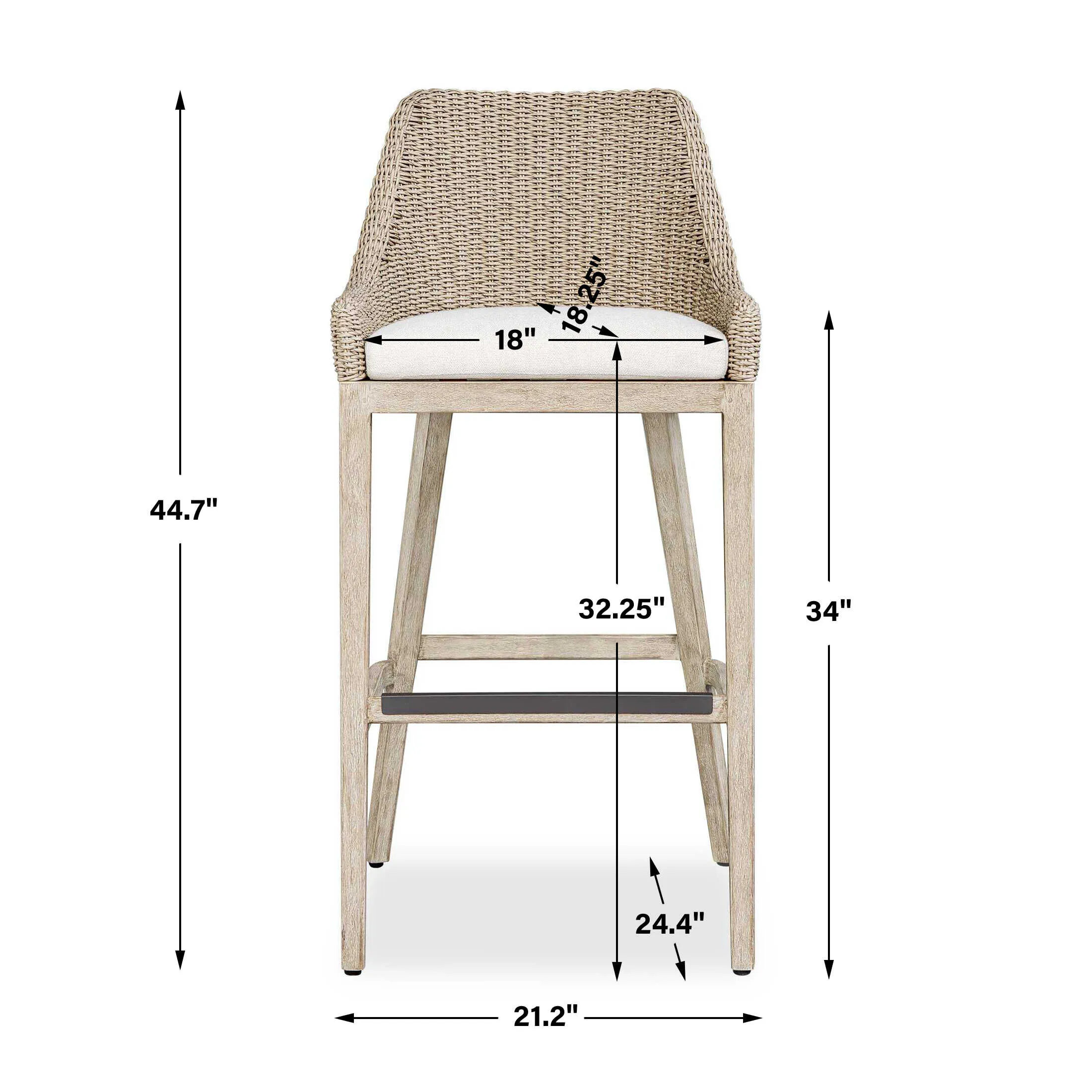 Enjoy Alfresco Dining In The Paloma Outdoor Bar Stool. It's Gently Sloped And Curved Back Gives Supportive Comfort, Wrapped In Twisted Oatmeal All-weather Wicker, Atop A Durable Mahogany Wood Frame Finished In Cerused Wheat, Ensuring Long-lasting Use. The Plush Cushion Is Upholstered In Oyster White Solution Dyed Acrylic Fabric That Is Constructed To Withstand The Moisture And Dirt That Comes With Outdoor Use.
