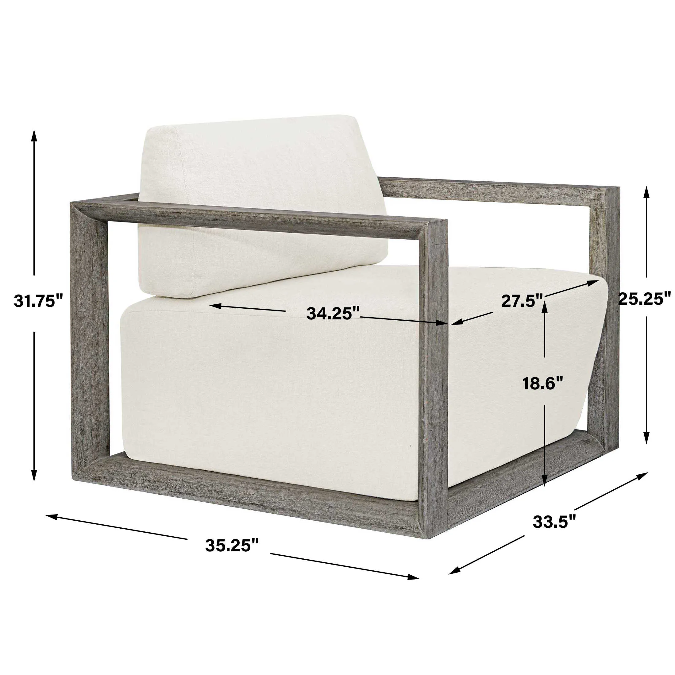 The Remsen Outdoor Lounge Chair Features A Striking Architectural Frame With Smooth Interior Curves That Give A Sculptural Presence. Constructed Of Solid Mahogany Wood In A Weathered Gray Finish With Wire-brushed Details. Its Generously Cushioned Floating Seat, Upholstered In An Oyster White Solution Dyed Acrylic Fabric, Is Designed To Withstand The Moisture And Dirt That Comes With Outdoor Use. Solid Wood Will Continue To Move With Temperature And Humidity Changes, Which Can Result In Cracks And Uneven Surfaces, Adding To Its Authenticity And Character.