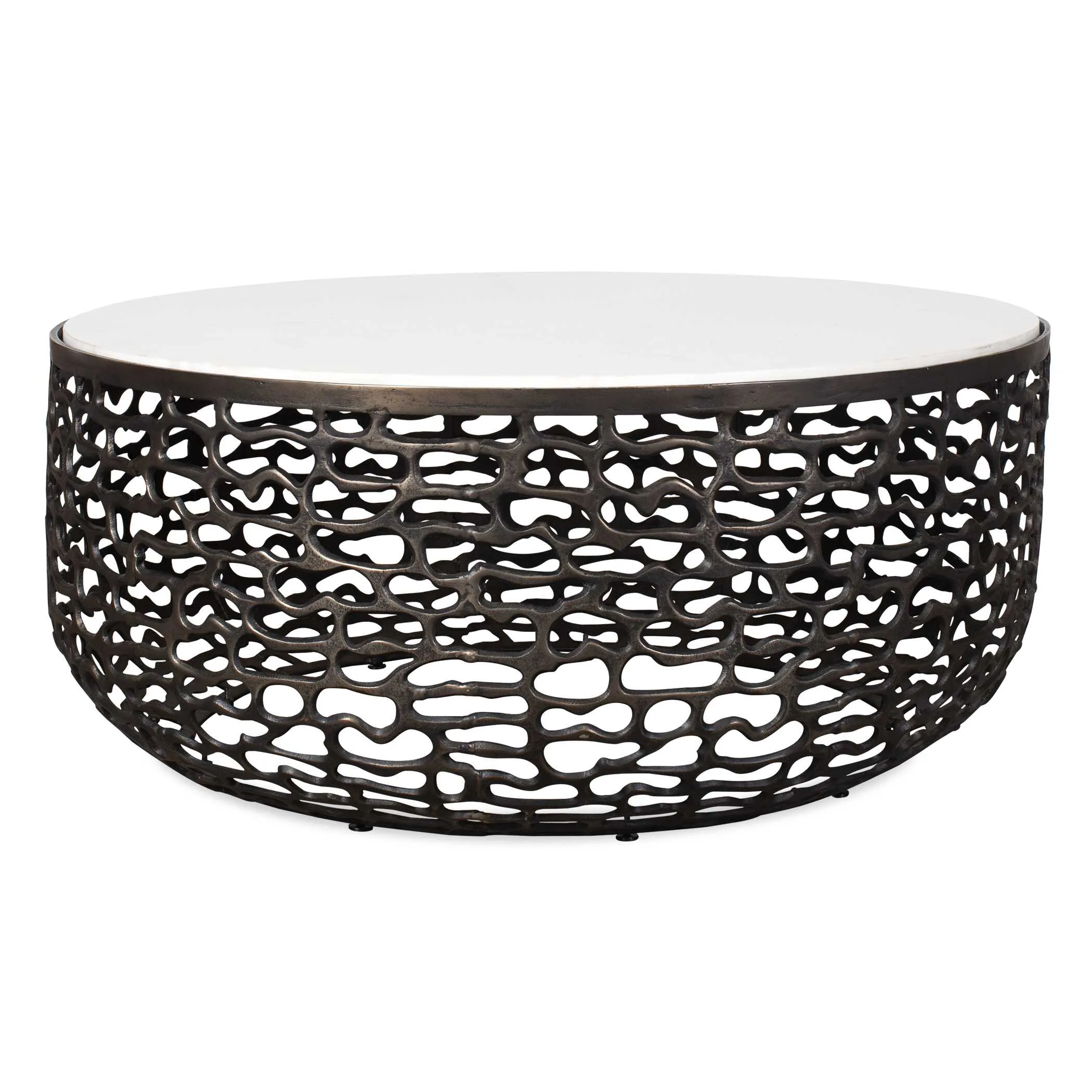 This Striking Coffee Table Boasts A White Marble Top With Subtle Gray Veining, Creating A Luxurious Contrast With The Golden Dark Bronze Finish Of Its Intricately Patterned Cast Aluminum Base. Due To The Nature Of Natural Stone, Every Piece Will Vary Slightly Ensuring Yours Is Unique. Suitable For Both Indoor And Outdoor Use.